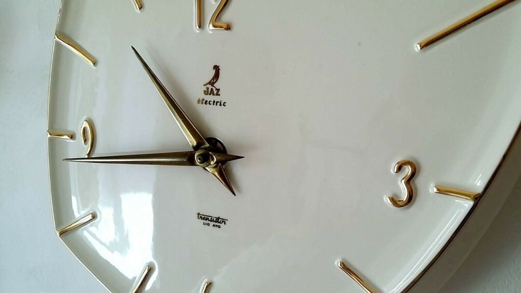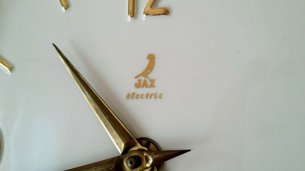 GUTIC , pendule murale , gamme Jaz Electric et Jaz Transistor , mouvement transistor et balancier moteur , calibre 1AN , à pile LR14 , licence ATO . Nouveauté du catalogue 1961/62 page 15 , référencée 2026-20 , faïence ivoire brillant made in Germany , cadran filet et index relief dorés , chiffres en relief et aiguilles dauphines dorées , sans trotteuse , format 22 x 23 cm , poids 620 gr sans la pile .