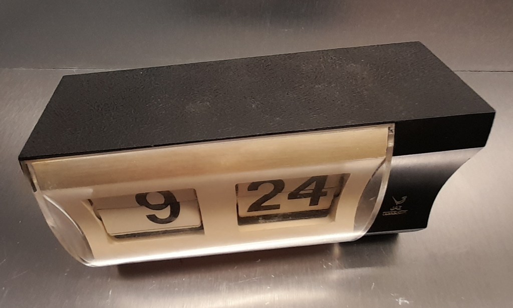 CHIFFRIC , horloge à lecture directe , Jaz transistor , digital , à lamelles , peut être posé ou accroché au mur , calibre 9AN dit aussi AN-VN à pile LR14 , sans fonction de réveil . Nouveauté du catalogue 1971/72 à la page 29 .Corps en plastique beige , cache mécanisme et changement d’heure en plastique gris clair à droite . Format 17,5 x 9 cm , poids 375 gr sans la pile . Attention : ne pas le confondre avec son « cousin » très proche le VIBRIC dont il partage l’aspect mais qui possède la fonction réveil , dans ce cas le logo est à gauche . Le nom de Chiffric est inspiré de l’emploi des chiffres en lecture directe . Référencé 2299-10 pour le modèle beige et 2299-40 pour le modèle noir. Le CHIFFRIC apparaît pour la dernière fois dans le tarif de Janvier 1976, il n’est plus mentionné dans ceux de Mai et Juillet .