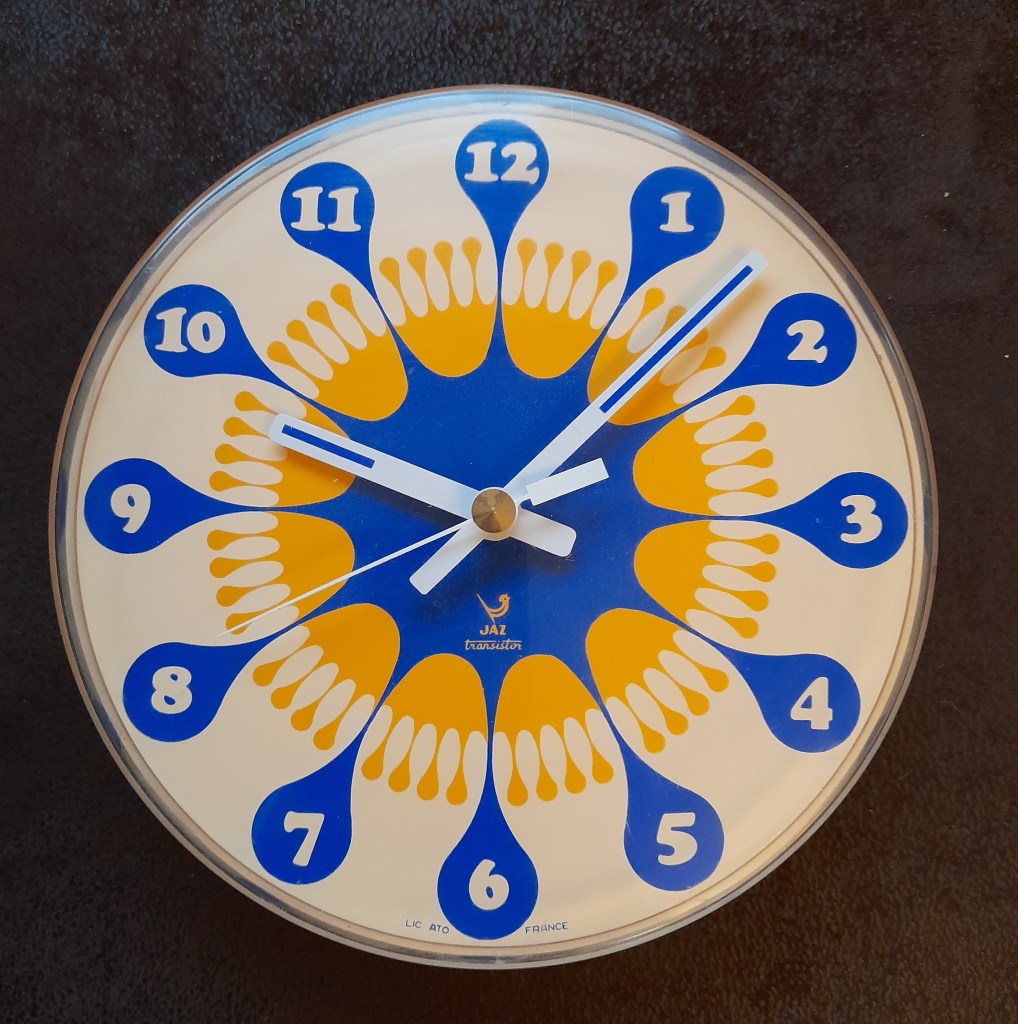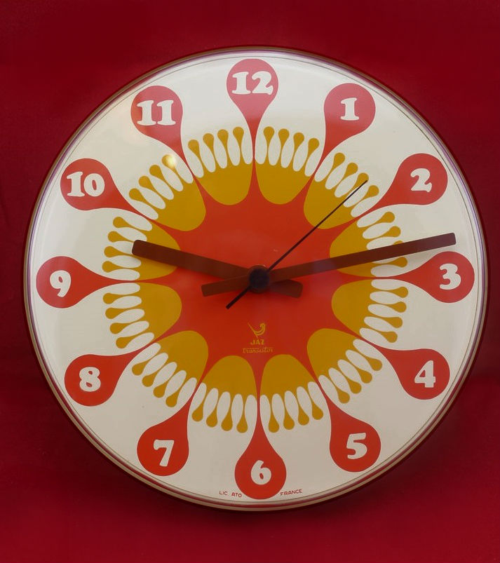 JASMIC , horloge murale , gamme Jaz transistor , calibre AX à pile LR14 , licence ATO . Nouveauté du catalogue 1972/73 . Corps en plastique , trotteuse centrale , vitre en plexiglas . Diamètre 23 cm, poids 410 gr sans la pile.