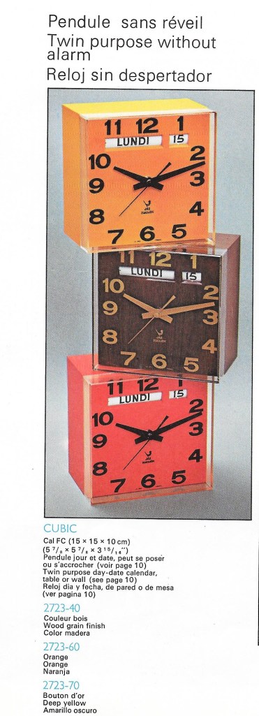 CUBIC , pendule à poser ou accrocher , gamme des Jaz Electronic , Jaz Transistor , mouvement à pile LR14 , calibre FC , licence ATO . Nouveauté du complément de catalogue 1973 à la page et présente au catalogue de 1974 à la page 6 . Donne le jour et la date , trotteuse centrale , sans fonction réveil . Existe en version imitation bois brun réf. 2723-40 , en orange intense réf. 2723 -60 et en » bouton d’or » jaune référencé 2723-70 ( modèle ci-dessus) . Format 15 x 15 x 10 cm, poids 630 gr . Sa forme cubique est évidemment à l’origine de son nom . Cette dénomination avait déjà été employée en 1931 et le sera de nouveau en 1983 .