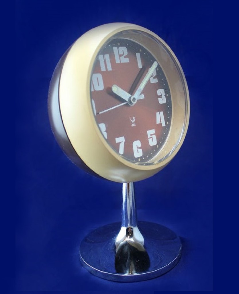 PODIC brun version 1975 , grand réveil de la gamme des Gros Jaz, mouvement mécanique , calibre PA , version à dos brun et cadran cognac irisé . Cette nouvelle version du PODIC est référencée 1223-97 à la page 37 du catalogue de 1975 . Corps en plastique bicolore ,vitre concave en plexiglas , pied tulipe amovible en plastique « chromé » qui est à l’origine de son nom , aiguilles métal , trotteuse centrale , arrêt de la sonnerie et réglage de l’heure sur petit cadran au dos , aiguilles et points lumineux . Dimensions : hauteur 20 cm , diamètre 13 cm . Vendu 95 Francs , il était en 1975 le plus cher des gros réveils Jaz . Le PODIC n’est plus disponible en 1978.