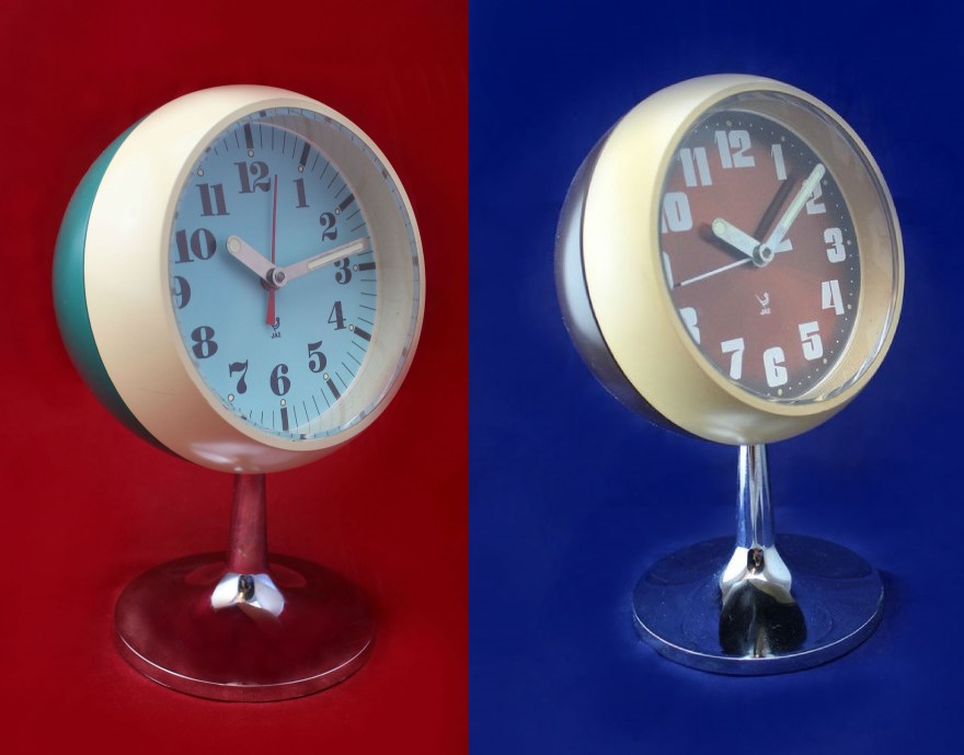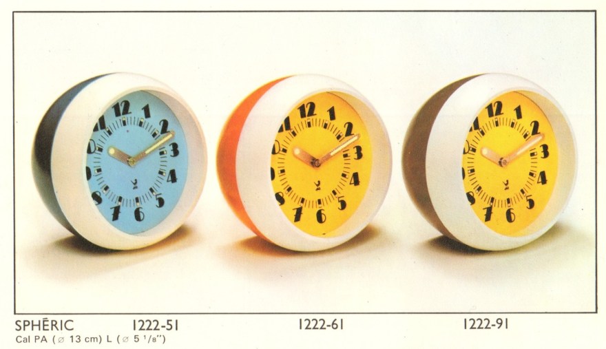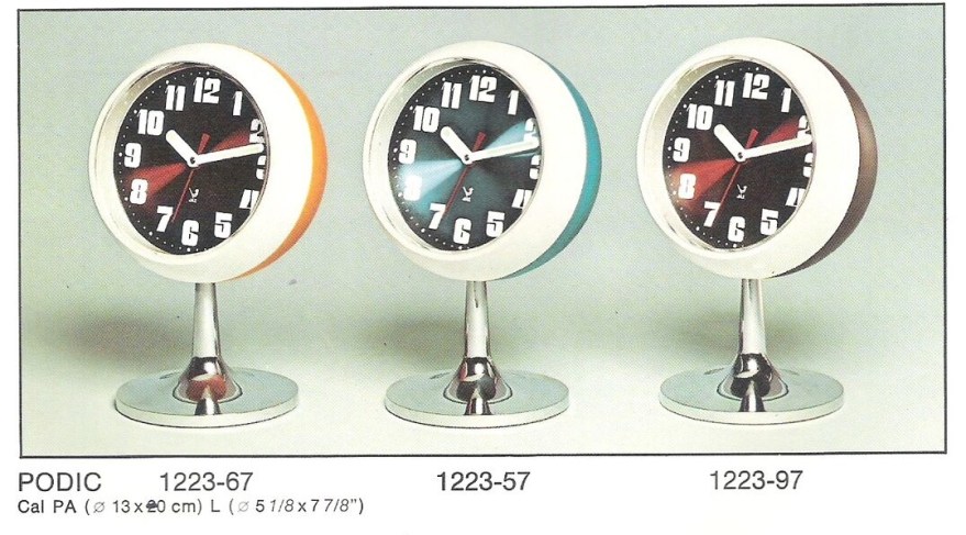 Les PODIC étaient disponibles dans cette version avec avec dos brun et cadran cognac irisé réf.1223-97 , mais aussi avec dos bleu et cadran bleu irisé réf.1223-57 et enfin avec dos orange et cadran cognac irisé réf. 1223-67. Vendu 95 Francs , il était en 1975 le plus cher des gros réveils Jaz .