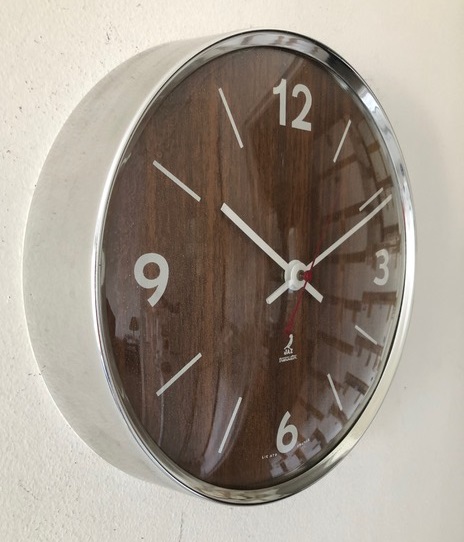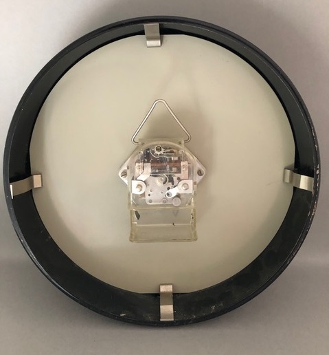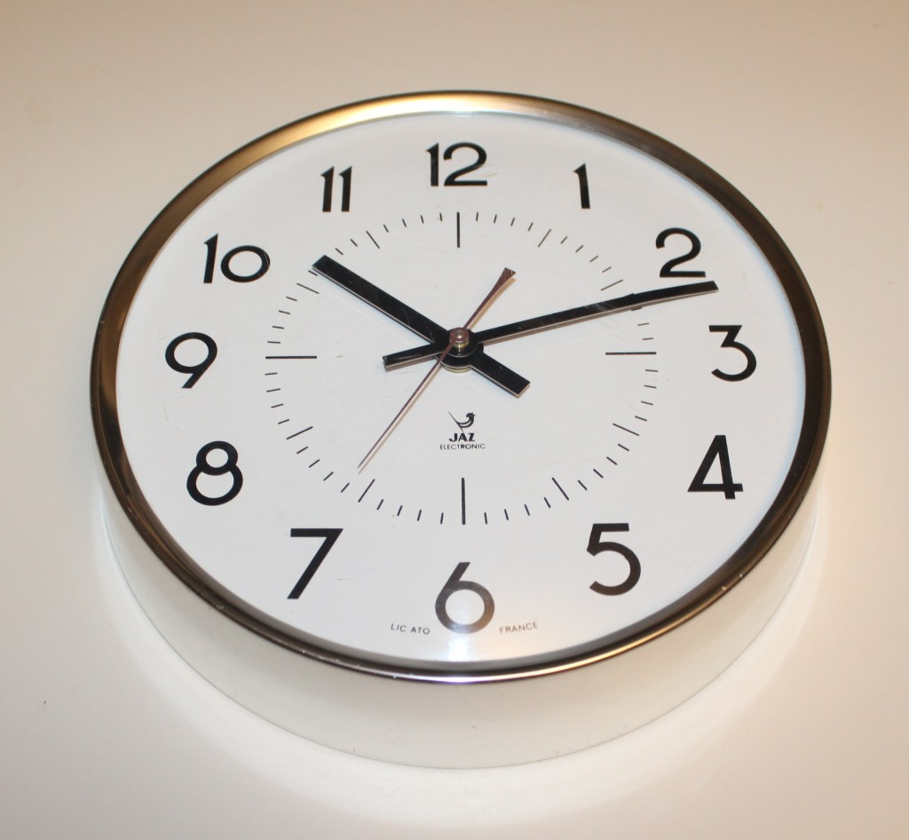 BEMIC , horloge murale , gamme Jaz Transistor , mécanisme à pile LR14 , calibre AX variante 4AX , licence ATO . Nouveauté du catalogue 1964 /65 à la page 12 . Corps en duralinox d’un diamètre 26,5 cm , poids 745 gr sans la pile LR14 , vitre en verre bombé , trotteuse centrale . Il s’agit d’un grand classique Jaz qui orna beaucoup d’ateliers , de bureaux et d’hôpitaux : il était encore au catalogue en 1976 !! En outre la BEMIC succédait à la MEBIC de 1962 , elle même héritière de la MOBIC de 1959 dont elle reprenait le format et la forme générale .Une version à dateur , la CALIC , est produite de 1972 à 1974 .