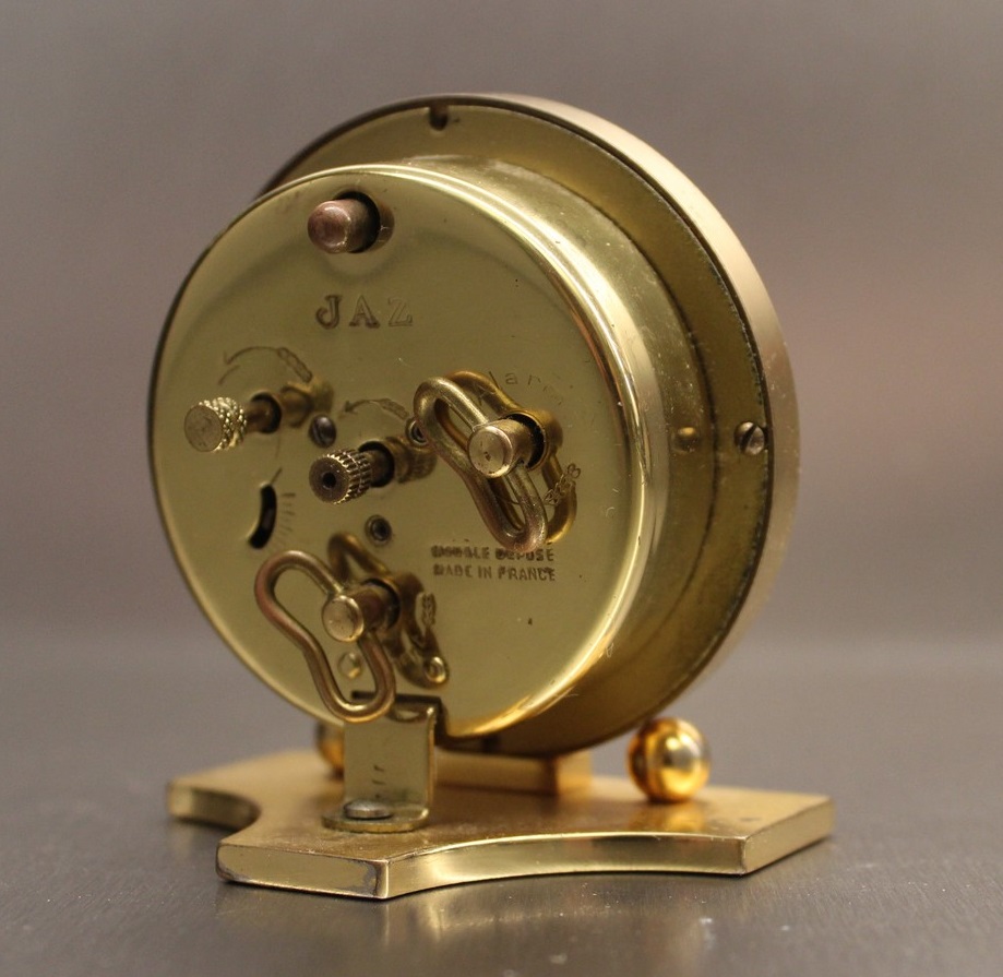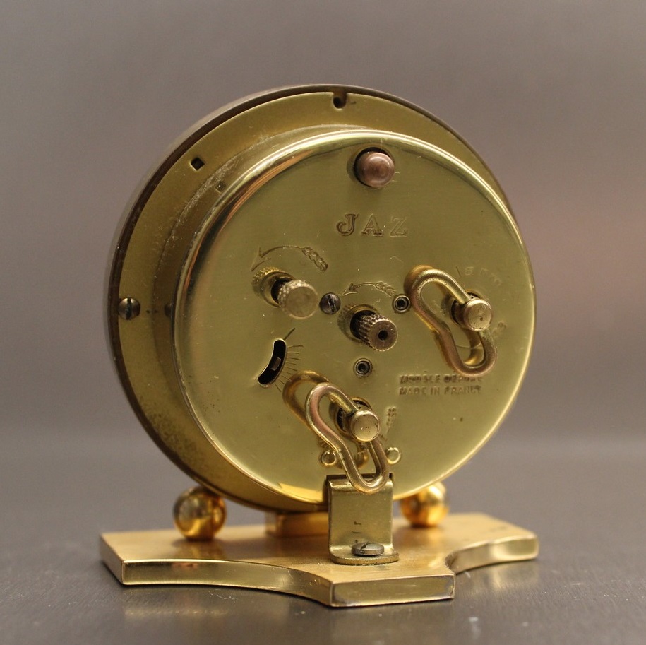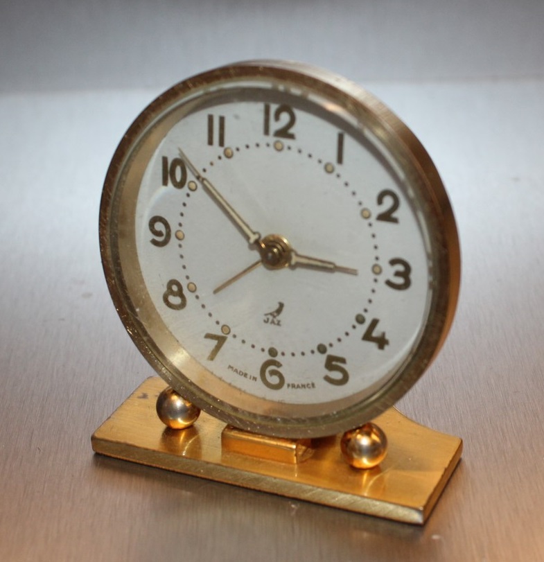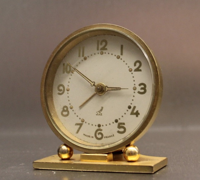 DOUCIC , petit réveil , gamme des Stylites , mouvement mécanique , calibre 1J . Nouveauté du catalogue 1951 , référencé 462-11 . Boîtier métal pieds boules et socle métal doré , cadran argenté , vitre en verre plat , aiguilles phalliques , aiguilles et points lumineux , mention Made in France en bas de cadran . Format 7 x 8 cm , poids 295 gr .