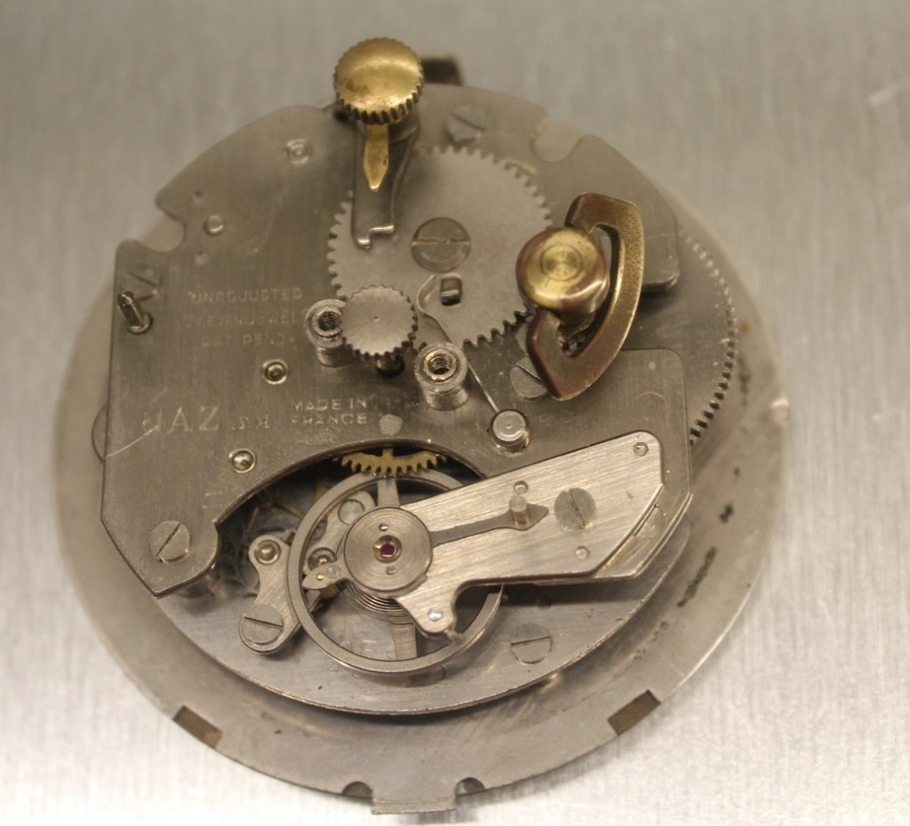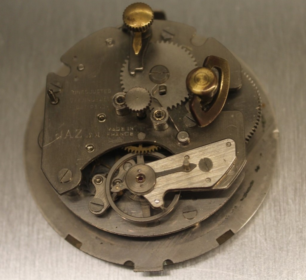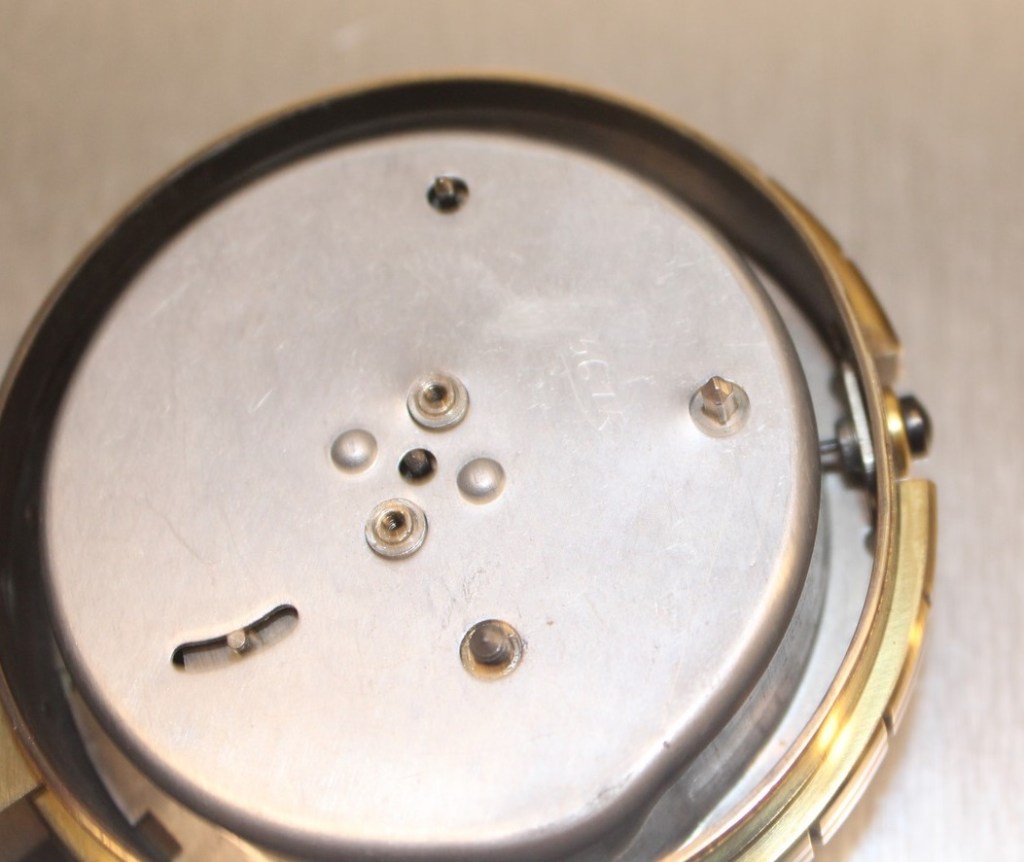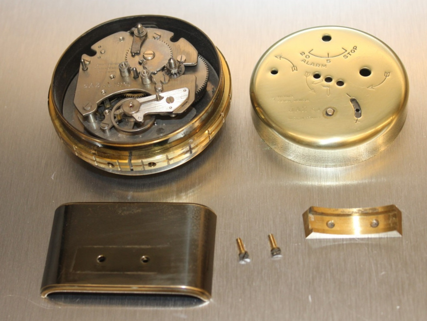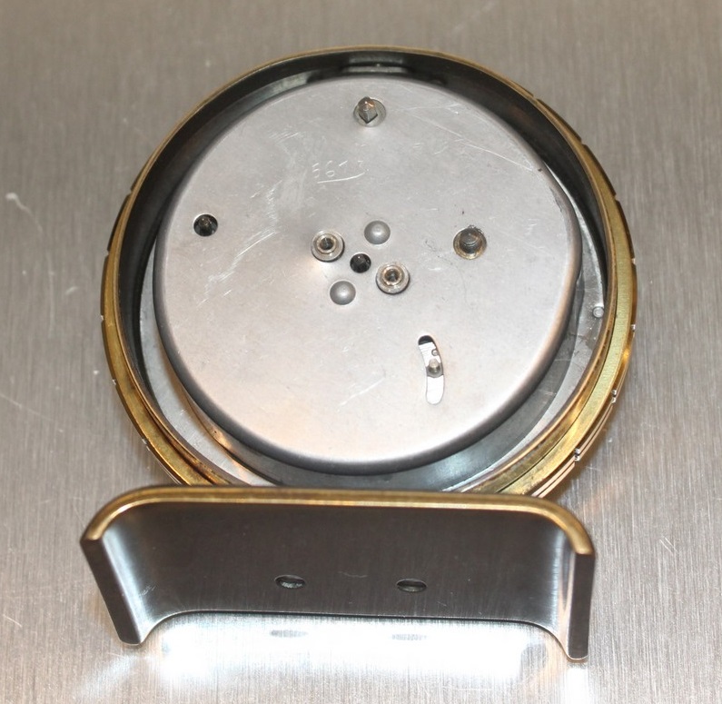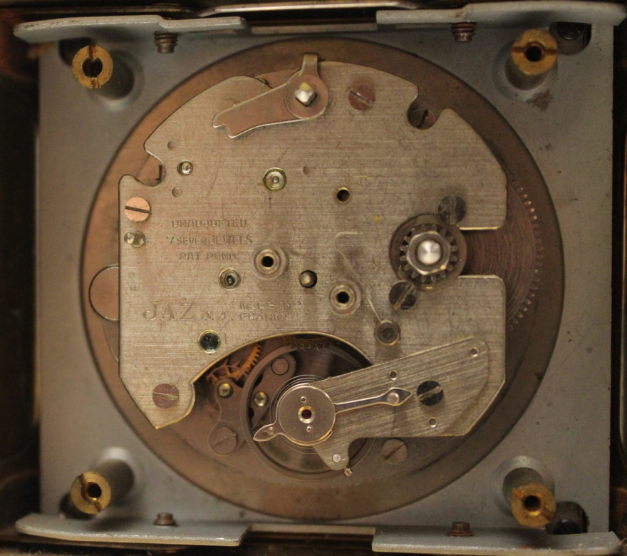 ce cache poussière sert de sécurité pour maintenir l’arrêt de sonnerie au sommet . Donc ATTENTION : une fois rétiré le cache poussière le bouton est libre et vous pouvez le perdre . Il porte gravé en creux, par l’horloger, la date de vente 561 pour Janvier 1956