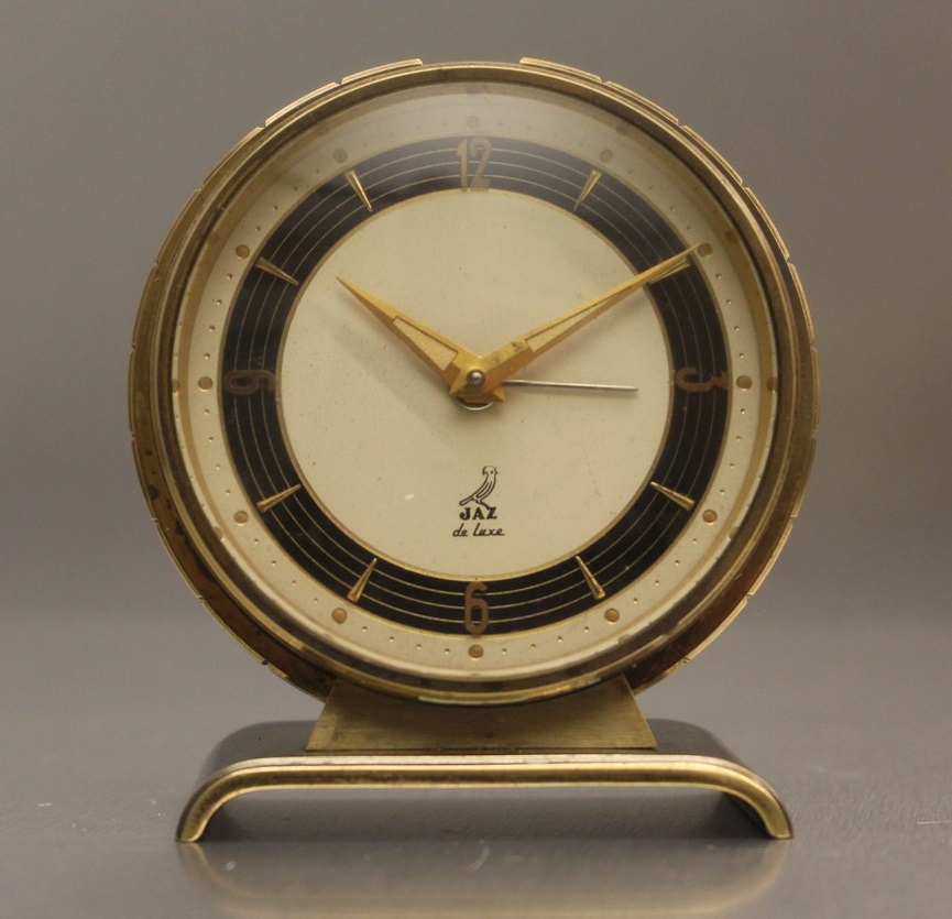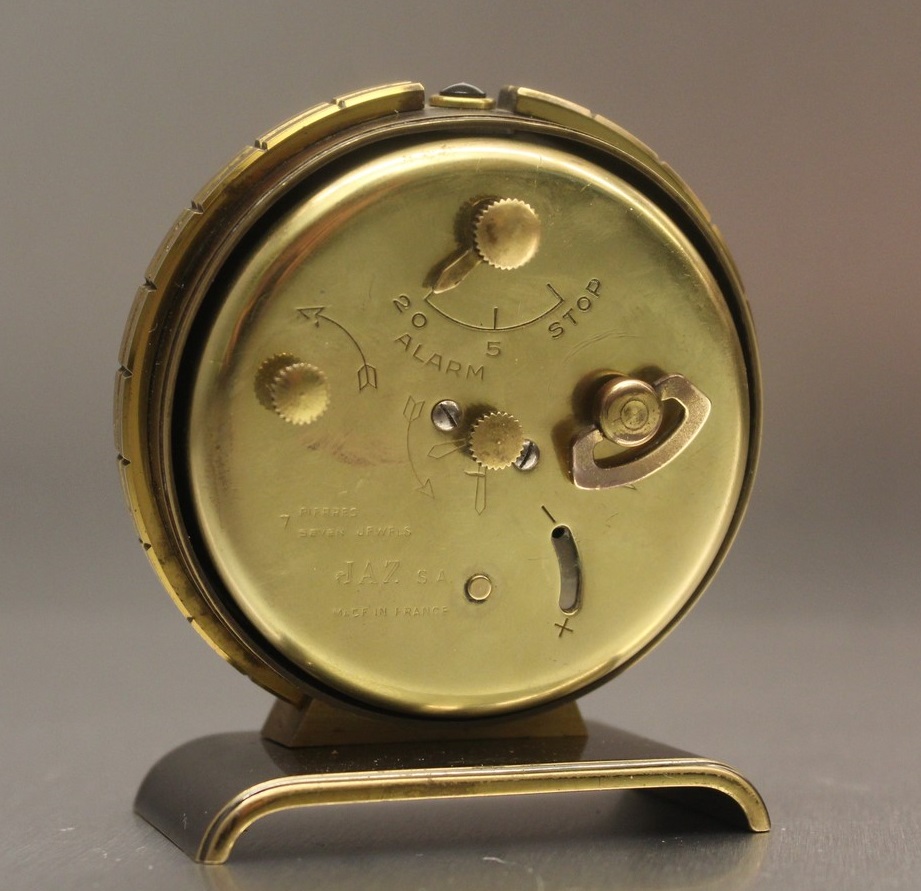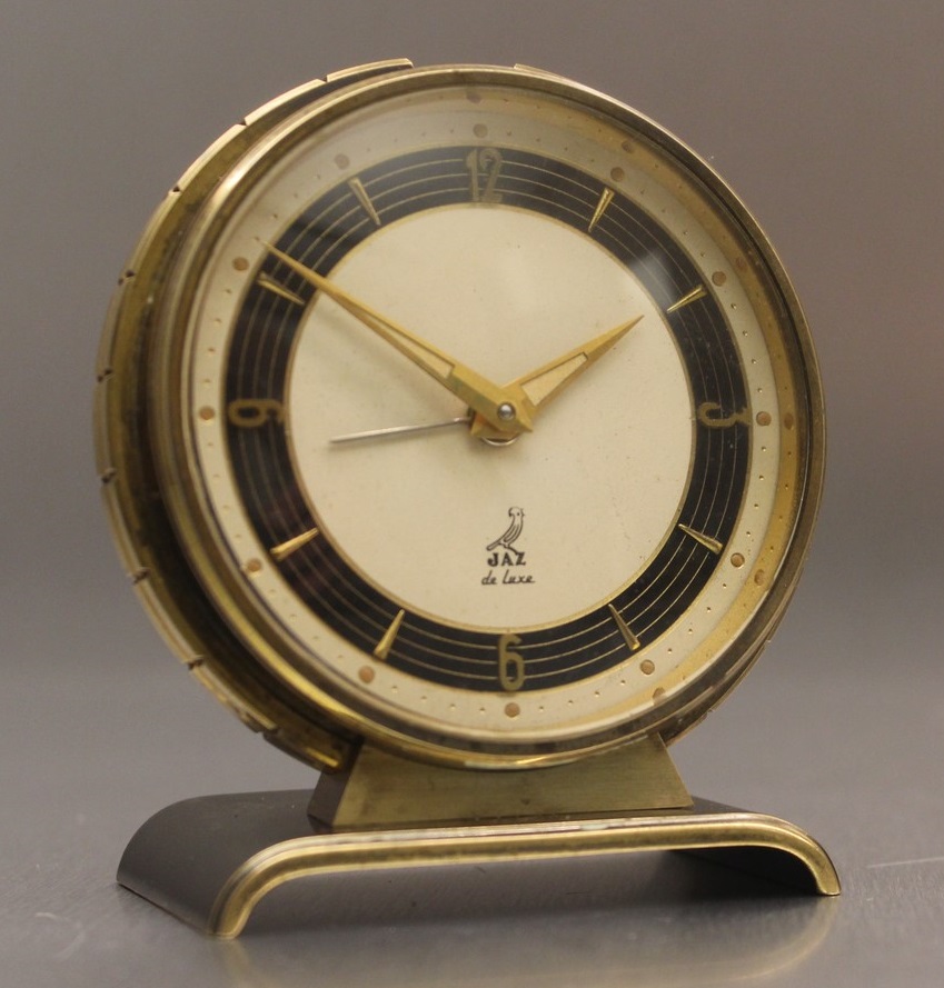 NATIC , petit réveil de la gamme Jaz de Luxe , à sonnerie limitable , mouvement mécanique, calibre AB , échappement à ancre 7 rubis ; un seul remontoir pour mouvement et sonnerie ; échappement et barillet indépendants . Nouveauté du catalogue 1955 à la page 2 , référencé 722-11 .