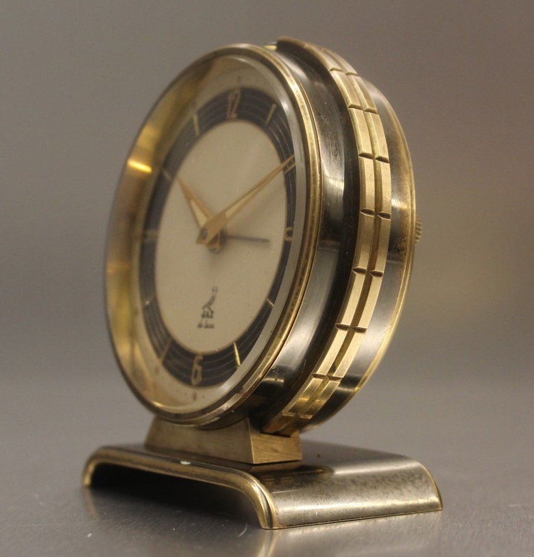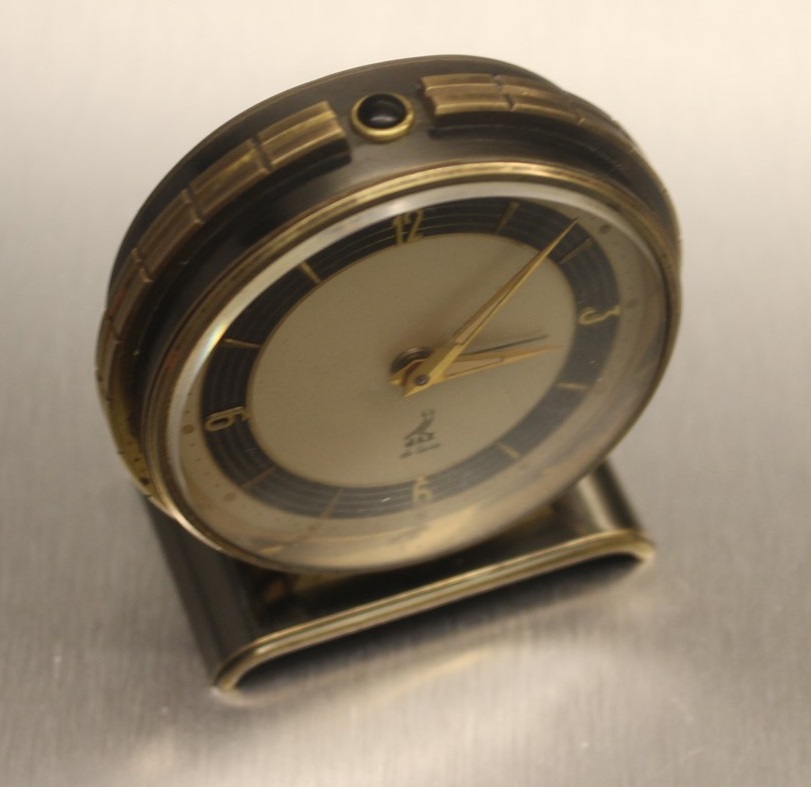 Boîtier et socle en métal polis gris mordoré, garnitures latérales et lunettes dorés ; cadran argenté satiné , quatre chiffres cardinaux et huit index , chiffres et huit traits d’heures dorés rapportés sur zone noire à cercles « or », glace bombée en verre biseauté , aiguilles dauphines, aiguilles et points lumineux . Diamètre 7 cm , poids 280 gr . Le NATIC n’est plus au catalogue en 1957 . Le nom de NATIC sera réattribué en 1978 à un radio réveil .