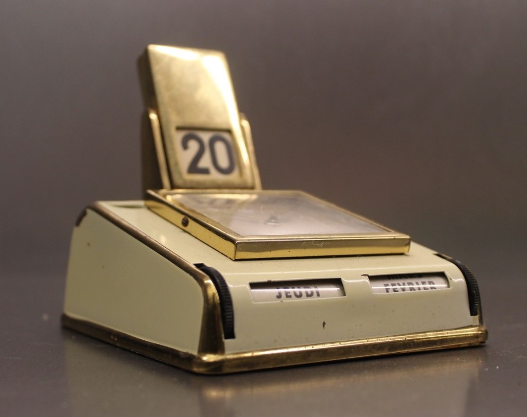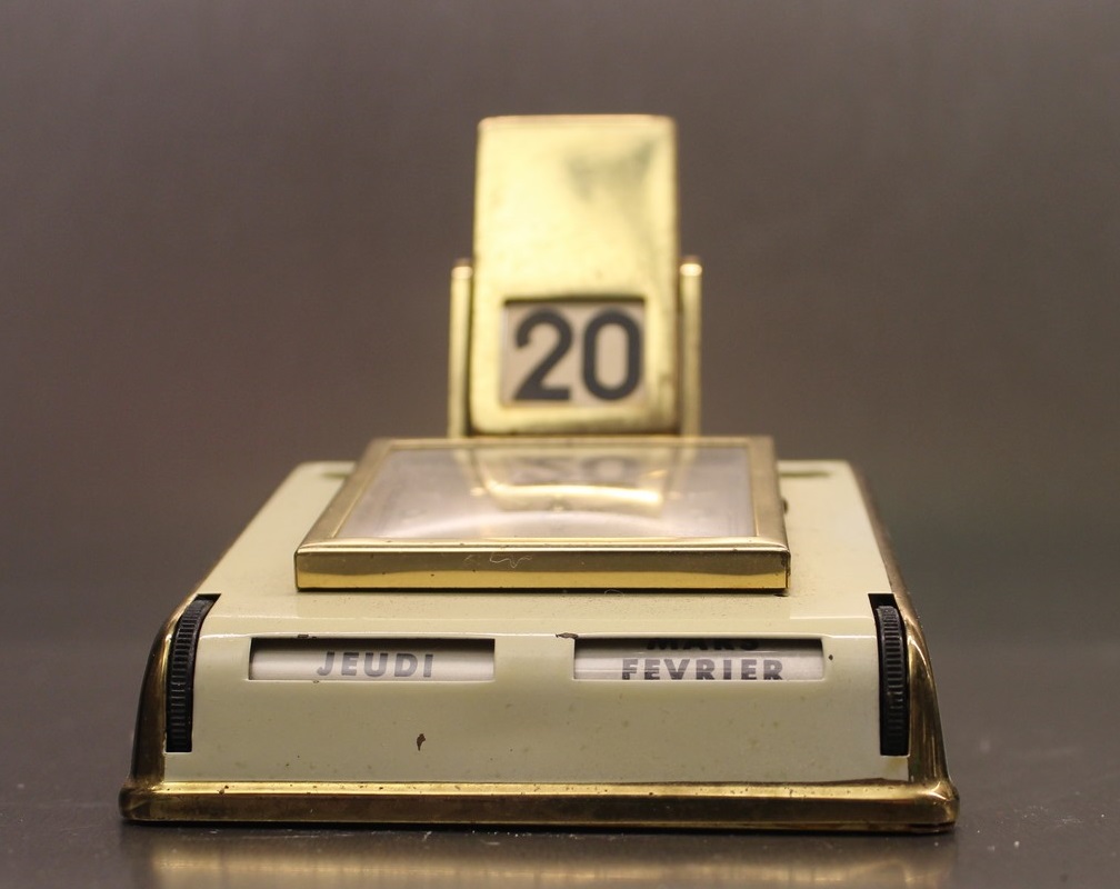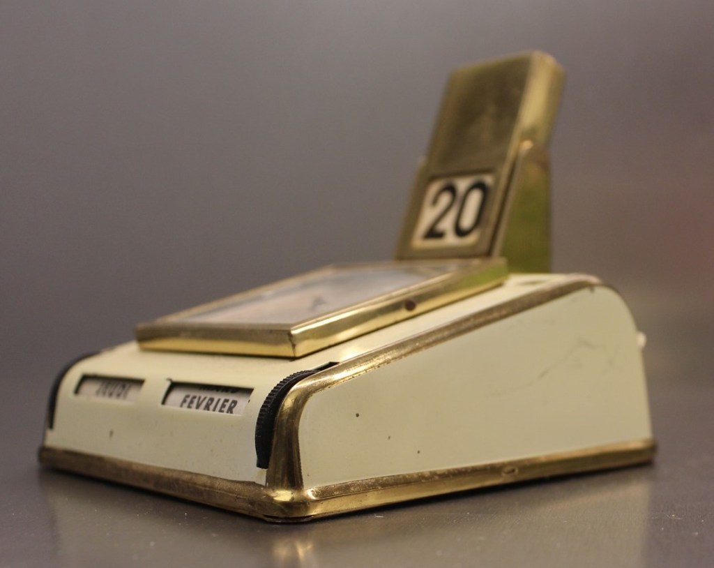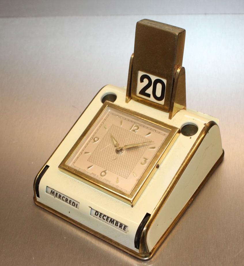TAGIC , pendule de bureau avec calendrier perpétuel , gamme Jaz de Luxe , mouvement mécanique 8 jours , calibre K , sans fonction réveil . Nouveauté du catalogue 1957 à la page 5 , référencée V 825-21 . Ensemble de boîtier en métal doré , cadran zone centrale quadrillée argenté brillant sur argenté mat , quatre chiffres cardinaux et huit points d’heures dorés sur zone argentée mat , calendrier perpétuel , logement pour crayons et notes , chemin de fer au pourtour , mention Made in France en bas de cadran , aiguilles flèches , aiguilles et points lumineux . Poids 490 gr , format 12 x 11 x 11 cm.