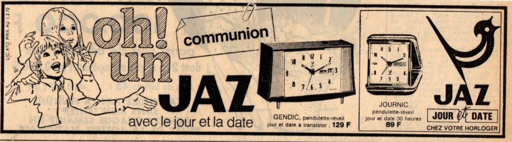 GENDIC , réveil pendulette de la gamme Jazistor , mouvement à transistor ,calibre 6AR à pile LR14 , licence ATO , réveil par sonnette interne . Nouveauté du catalogue de 1968/69 à la page 14 , référencée 2510-41 . PREMIERE MONDIALE : ces Jazistors à calendrier automatique , sont les premières pendulettes à transistor au monde à indiquer le jour et la date . Beau succès pour cette innovation et son look puisqu’il se maintient au catalogue jusqu’en 1975 .