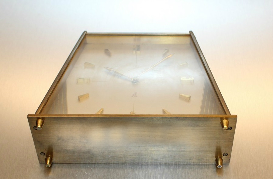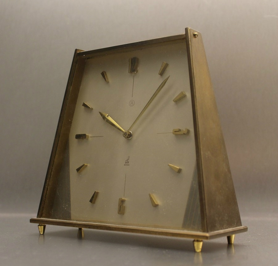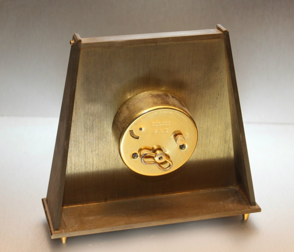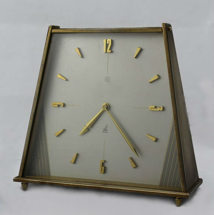 PLAISIC , pendule à poser , de la gamme Jaz de Luxe et gamme Jaz à Tirage Limité , mouvement mécanique à ancre , 7 pierres , calibre K , autonomie 8 jours , sans fonction de réveil . Nouveauté du catalogue 1957 à la page 4 , référencée V 868-10 . Boîtier en forme de pyramide tronquée , métal tanké façon or , cadran argenté , quatre chiffres cardinaux en relief et huit index dont la forme « en coin » reprend celle du boîtier, aiguilles flèche et glaive dorées , non lumineux . Format 16,5 x 15,5 cm , poids 1,040 kg . Présent au catalogue 1958/59 à la page 5 , il ne l’est plus en 1959/60 ce qui est , somme toute , normal pour un « tirage limité « .