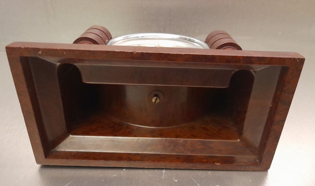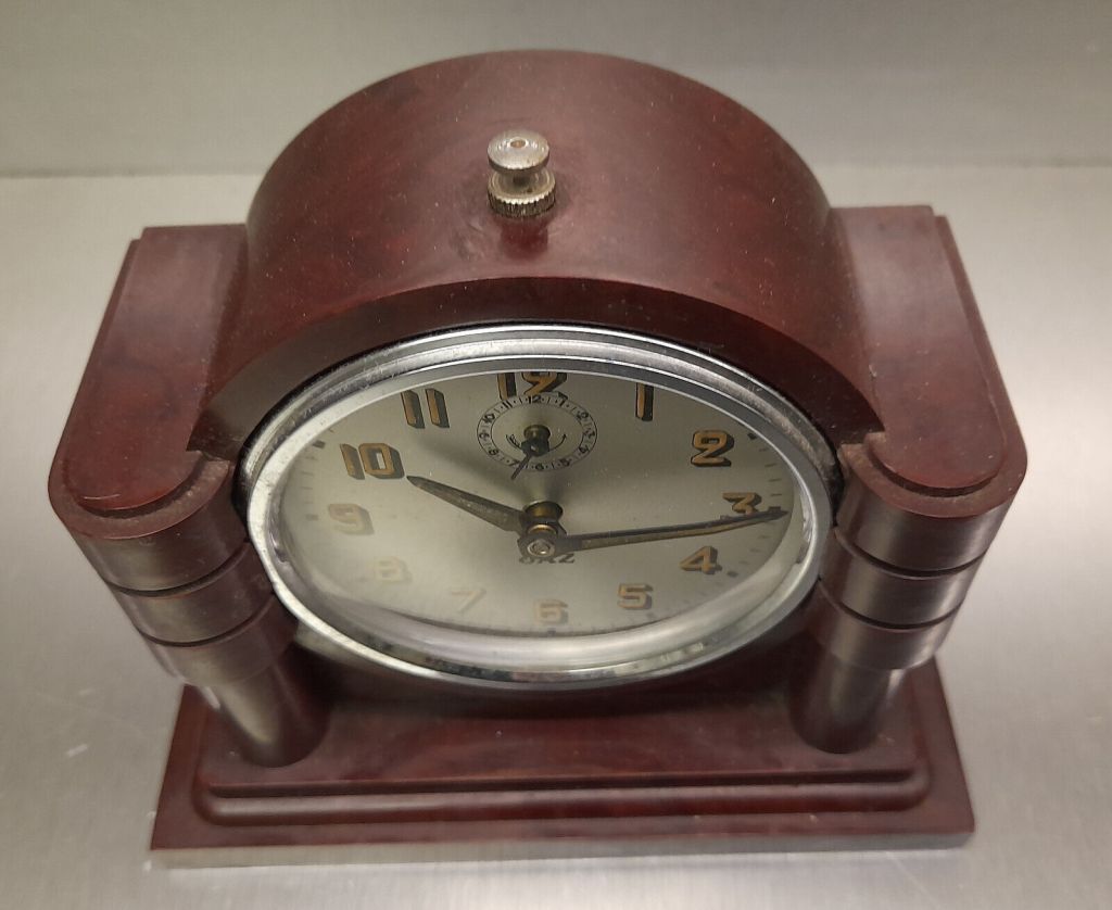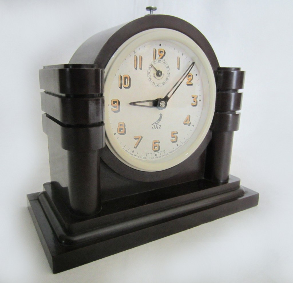 lunette émaillée blanc TOURIC , grand réveil , gamme des Pendulites , mouvement mécanique, calibre 1D. Présenté dans le catalogue de 1942 à la page 5 . Boîtier en Jazolite thuya , lunette en métal chromée ou émaillé blanc , vitre en verre bombé , arrêt de sonnerie au sommet , mentions en bas de cadran : Made in France et CIMH , aiguilles alphas . Format 120 x 155 mm , poids 580 gr .