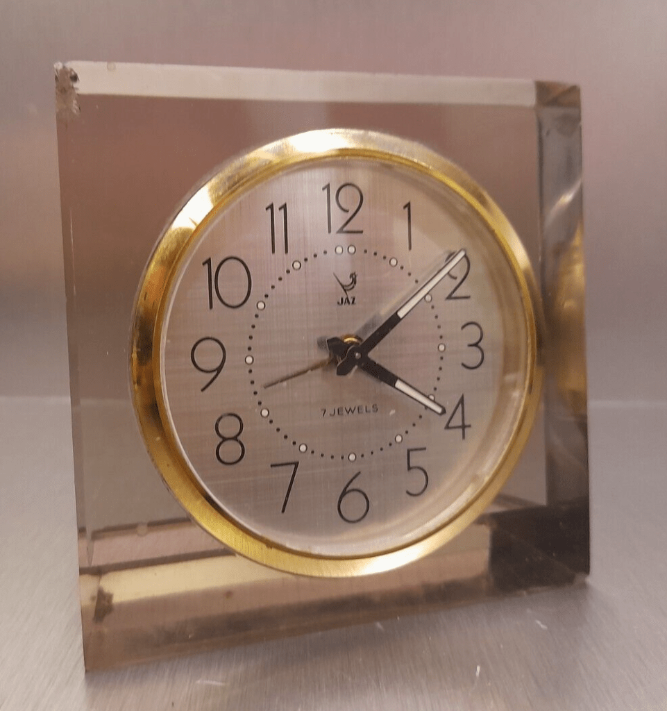 FUMIC , petit réveil , mouvement mécanique , calibre CS , 7 jewels . Nouveauté du catalogue de 1979 à la page 30 , réf. 1475-71 . Boîtier en plexiglas teinté, lunette métal façon or , cadran alu brossé , aiguilles et points lumineux . Format 8 x 8 cm, poids 175 gr. Le plexiglas teinté (altuglas) aux apparences de verre fumé lui a donné son nom . Dernière apparition au catalogue 1982 .