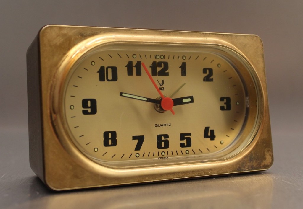 En 1983 le NIRIC fait l’objet de modifications : les aiguilles sont plus fines , la trotteuse devient noire et l’arrêt de sonnerie au sommet est déplacée vers le côté entraînant des changements de références : 8114-31 pour la version chromée et 8114-71 pour la version dorée. Format 10,5 x 6,7 cm , poids 110 gr . Il n’est plus en vente en 1985 . Il reprend forme , couleur et cadran du RIGNIC . N’exposez pas ce type de réveil au soleil , la fine trotteuse en plastique aura tendance à se courber et toucher les autres aiguilles .