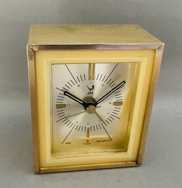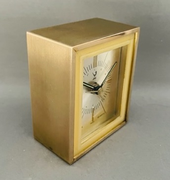 NULIC , réveil à quartz , sonnerie par moduleur buzzer , mouvement électrique à pile LR6 , calibre RK . Présenté dans le catalogue de 1980 à la page 2 , réf.8002-71 . Boîtier en laiton , aiguilles et points lumineux , trotteuse centrale dorée, pas de chiffres mais des index, mentions Paris France en bas de cadran . Format 6 x 7 cm, poids 282 gr. Très proche de son voisin sur le catalogue le PIOMIC , horizontal à cadran noir .