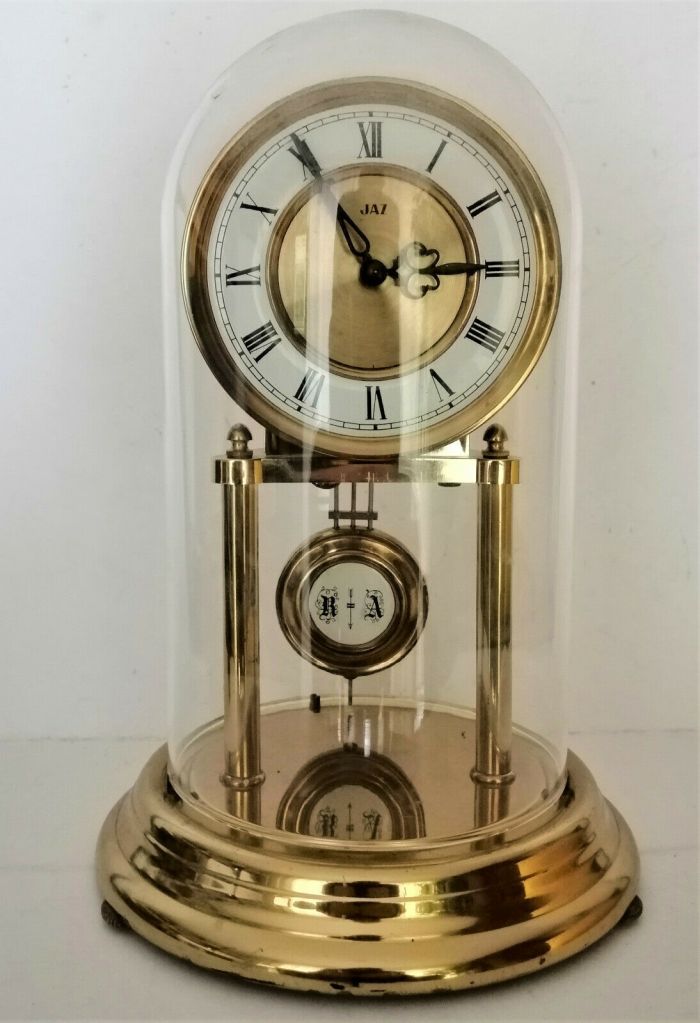 CLOCHIC , pendule à poser , 400 jours , à sonnerie « bim-bam », mouvement électro-mécanique, calibre PH , le H de cette dénomination fait référence au mouvement 541-071 par Hermle , fabricant allemand . Nouveauté du catalogue 1979 à la page 15 , réf. 4904-10 . Corps en métal doré , sous cloche en plexiglas , lunette et centre de balancier en émail , chiffres romains , aiguilles non lumineuses . Les lettres R et A sur le balancier sont les acronymes de Retard et Avance . Diamètre 19,5 cm, hauteur 30 cm . La CLOCHIC est présente pour la dernière fois au catalogue 1984 . Evidemment c’est la cloche qui la protège qui est à l’origine de son nom . La pile se loge sous le socle .