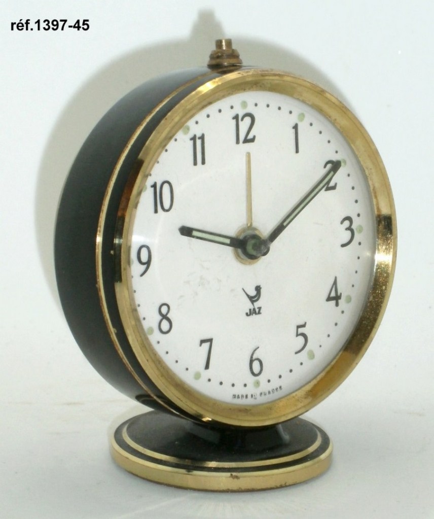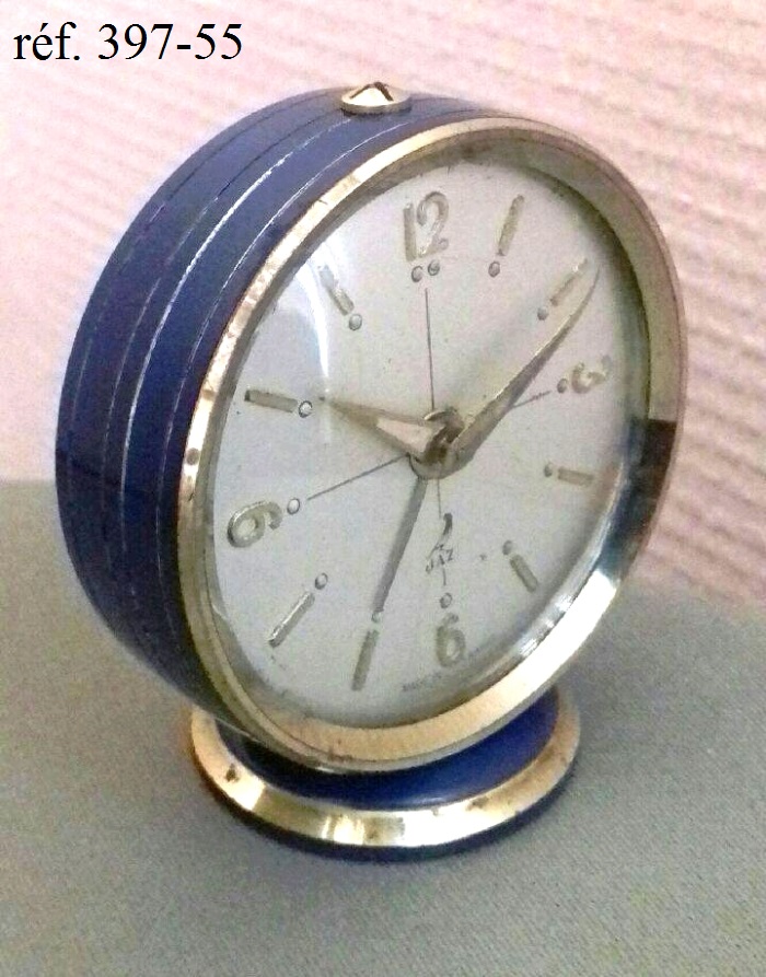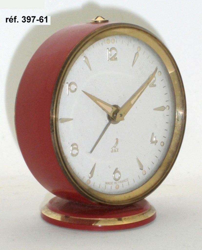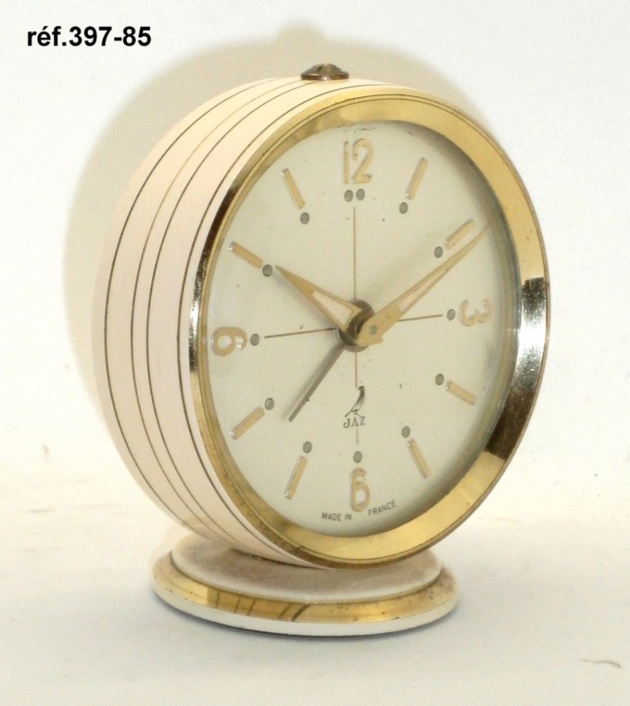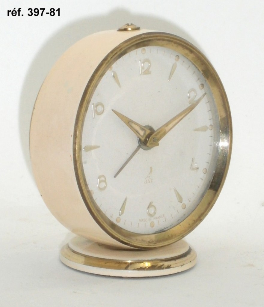 SCINTIC , petit réveil de la gamme des Stylites , mouvement mécanique , calibre J . Nouveauté du catalogue de 1960-1961 à la page 8 . Boîtier et socle en métal laqué et métal façon or finition diamant , chiffres en relief , filets façon or, aiguilles dauphines , aiguilles et points lumineux , arrêt de sonnerie au dos uniquement . Diamètre 6,5 cm, poids 150gr.