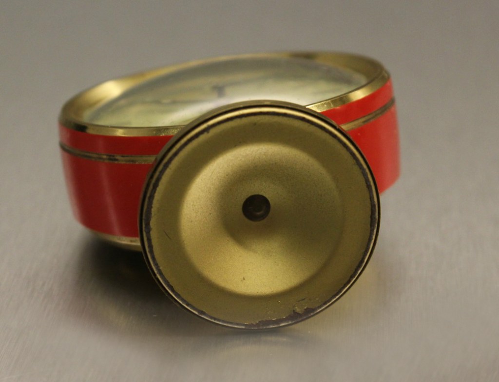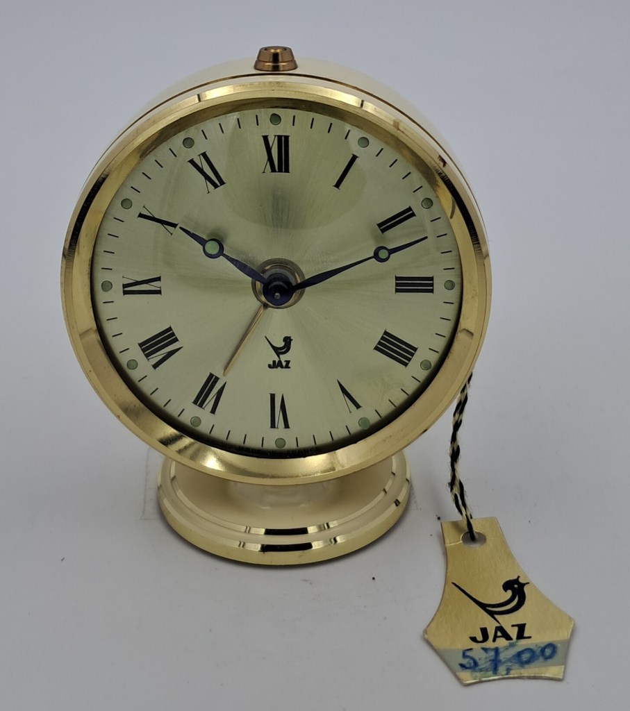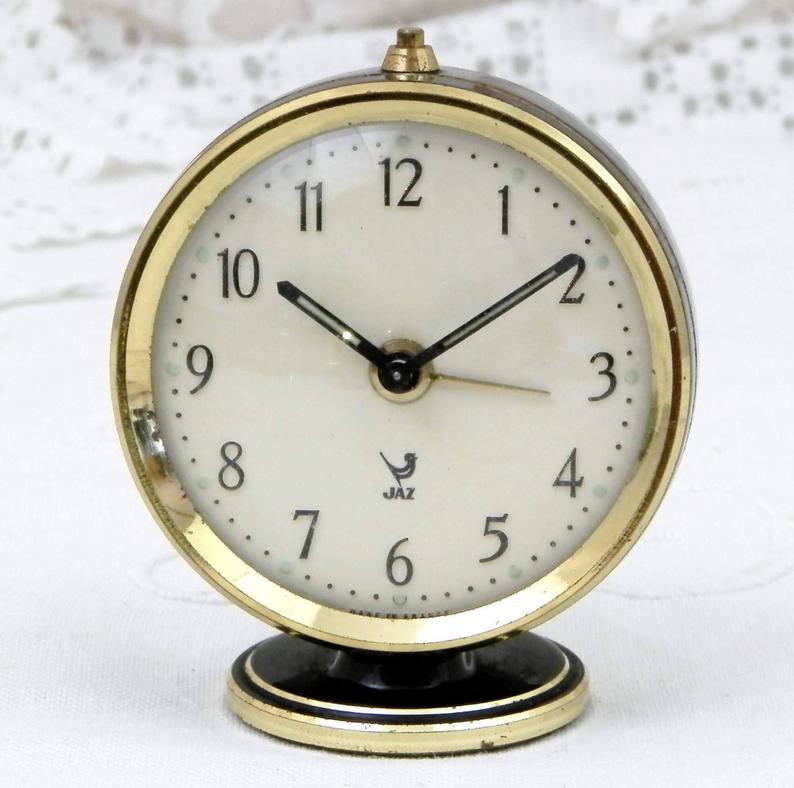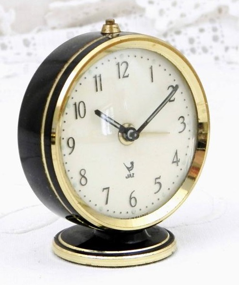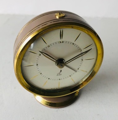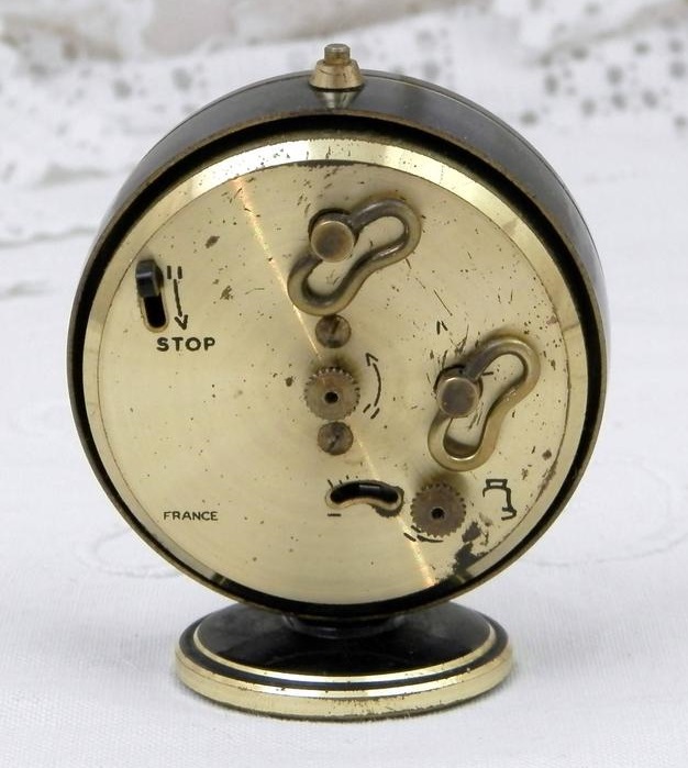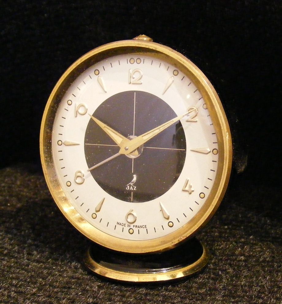 SCINTIC , petit réveil de la gamme des Stylites , mouvement mécanique , calibre J . Nouveauté du catalogue de 1960-1961 à la page 8 . Boîtier et socle en métal laqué et métal façon or finition diamant , chiffres en relief , filets façon or, aiguilles dauphines , aiguilles et points lumineux , arrêt de sonnerie au dos uniquement . Diamètre 6,5 cm, poids 150gr.
