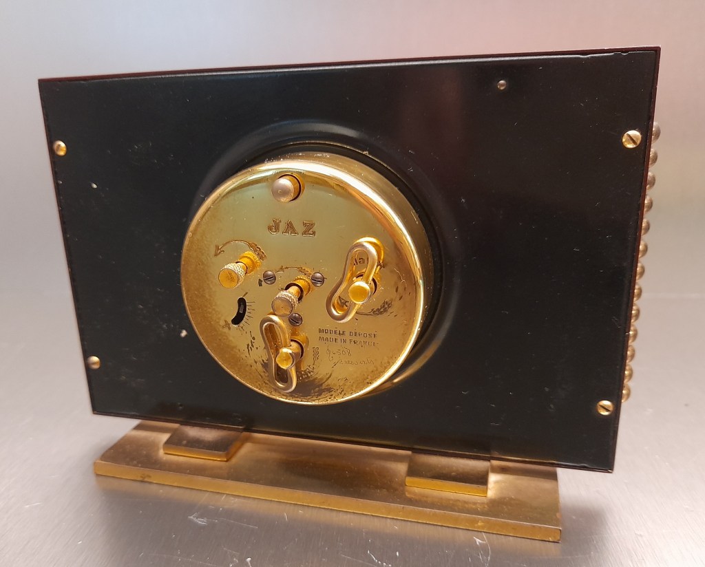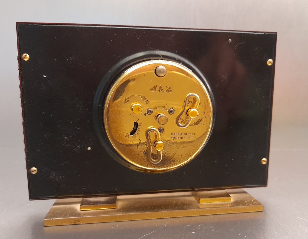Boîtier alumité – protection par une couche d’aluminium- couleur bronze foncé , cadran métal , vitre en verre biseauté , socle en métal doré , aiguilles et barrettes lumineuses . Format 14,5 x 10,5 cm, poids 495 gr . En vente jusqu’en 1955 .