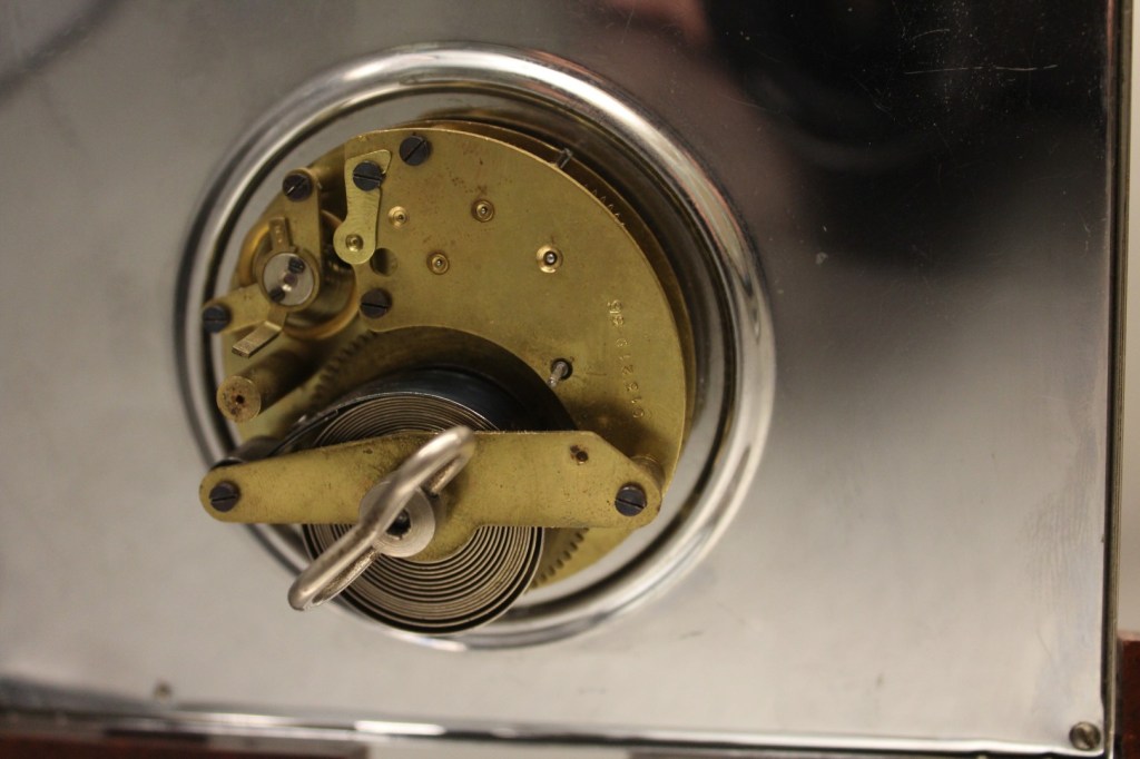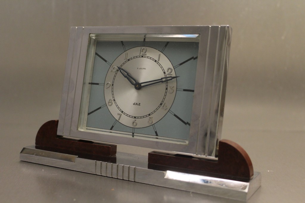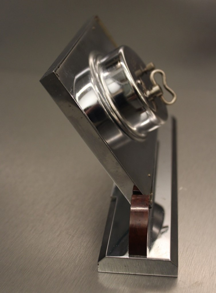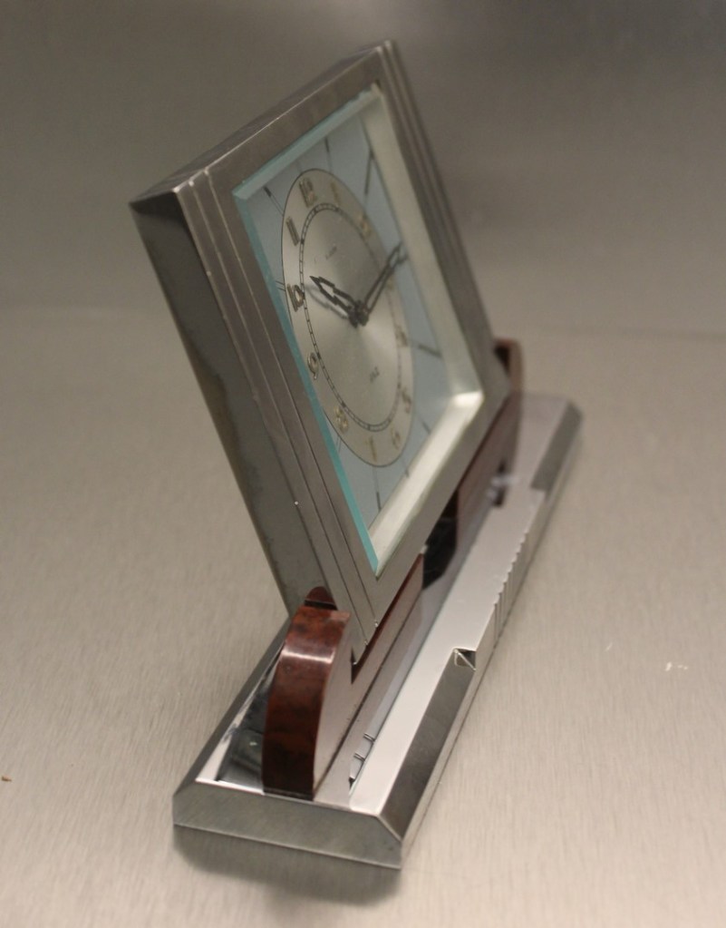 AMPLIC n°4800 AMPLIC , pendulette , gamme des Stylites , mouvement mécanique , calibre K , 11 jewels, autonomie 8 jours , sans fonction réveil . Chevalet socle chromé , supports en bakélite , inclinable , vitre en verre biseautée , cadran métal , chiffres chromés rapportés , aiguilles bleuies , chemin de fer à l’intérieur de la zone des heures , mention 8 jours sous le XII . Présent au tarif d’Août 1936 et au catalogue de l’été 1937 . Deux versions disponibles : n°4801 avec barrettes et chiffres lumineux et n°4800 non lumineuse . Format 20 x 12 cm .
