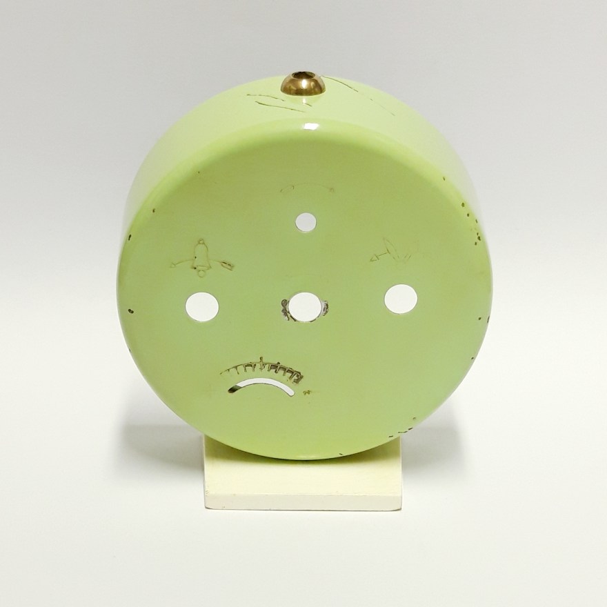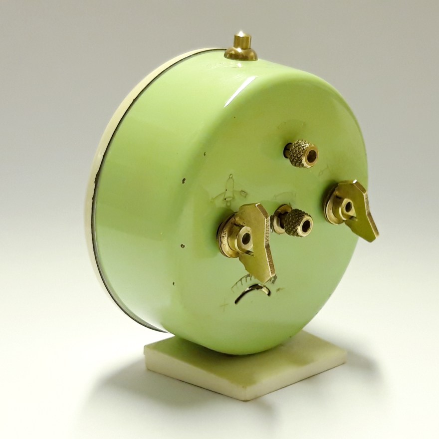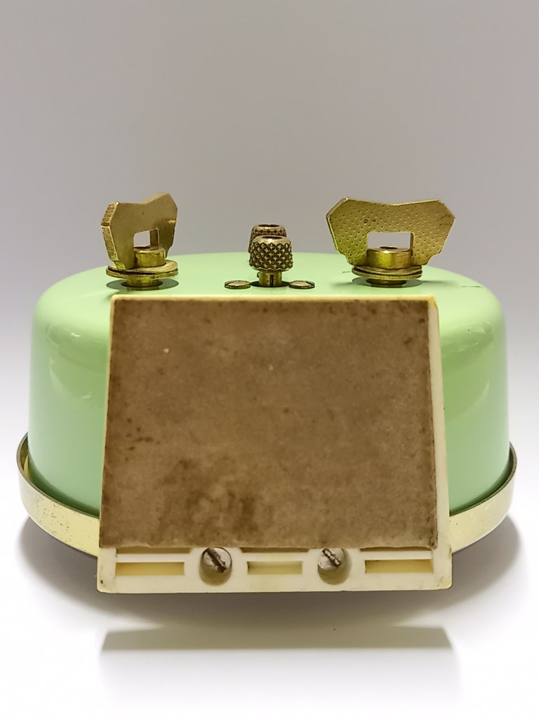 Ci -dessous la première version du PITIC 68-70 : le boitier à un socle riveté. Le bas du boitier à des ouvertures avec une grille fine pour que le son de la sonnerie s’entende bien. La cloche de la sonnerie est vissée sur la platine arrière. Le verre est en polycarbonate maintenu sur le boitier par le cerclage blanc.