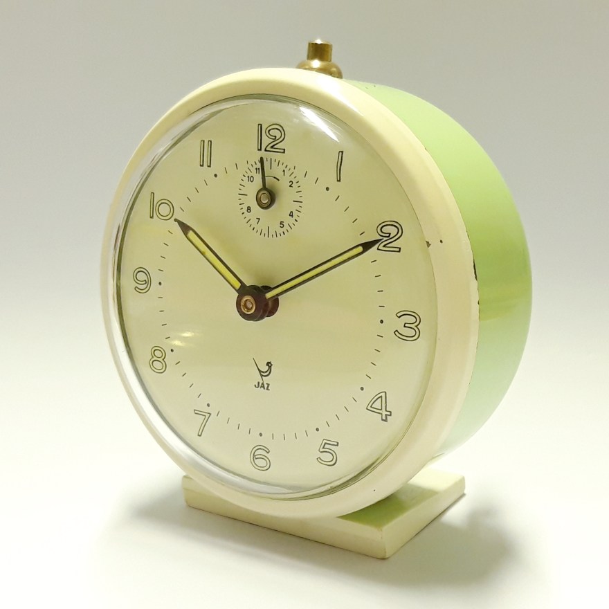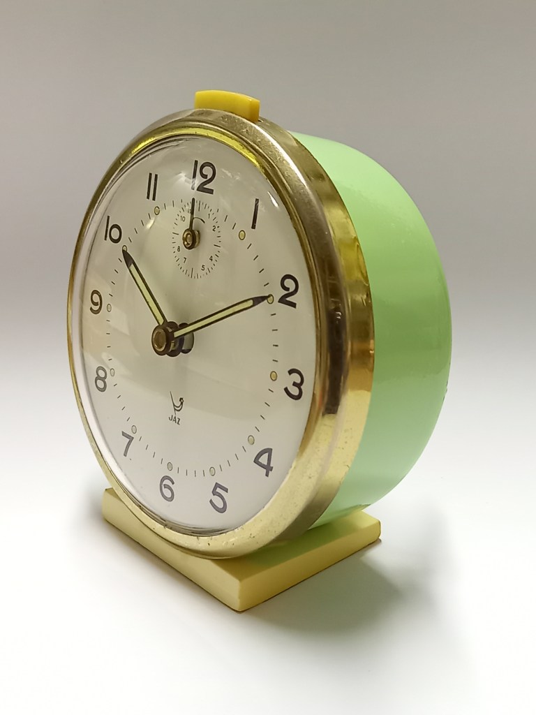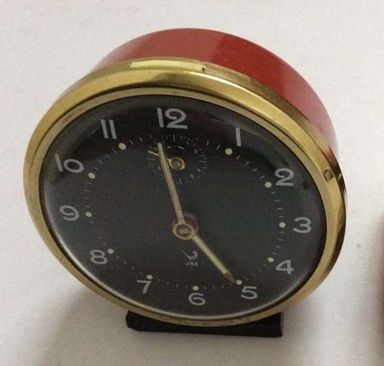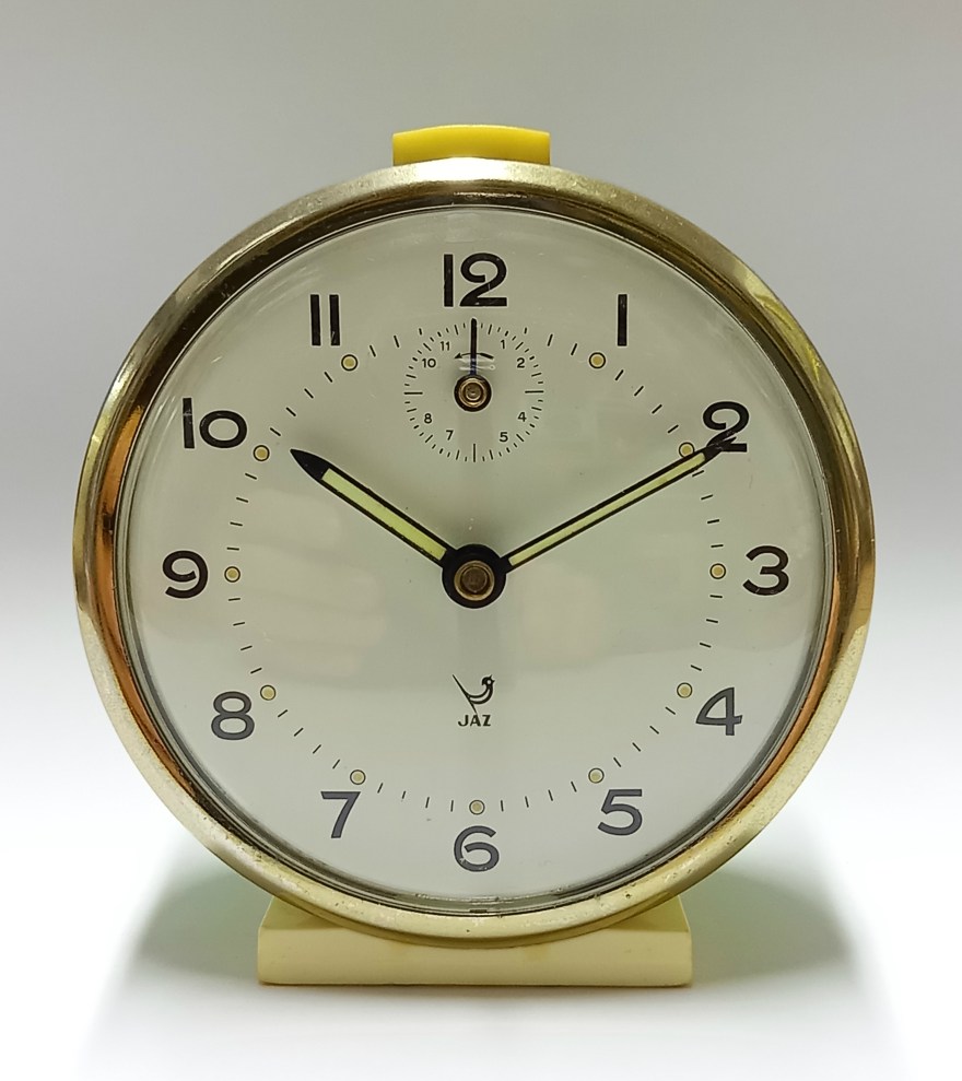 PITIC , réveil de la gamme des Gros Jaz , mouvement mécanique, calibre PA . Nouveauté du catalogue de 1968-1969 à la page 31 . Boîtier en métal , vitre en plexiglas bombé , bouton d’arrêt de sonnerie au sommet , aiguilles et points lumineux , garniture en métal doré , finition diamant , socle en plastique qui peut être noir ou blanc . Diamètre 8,7 cm .