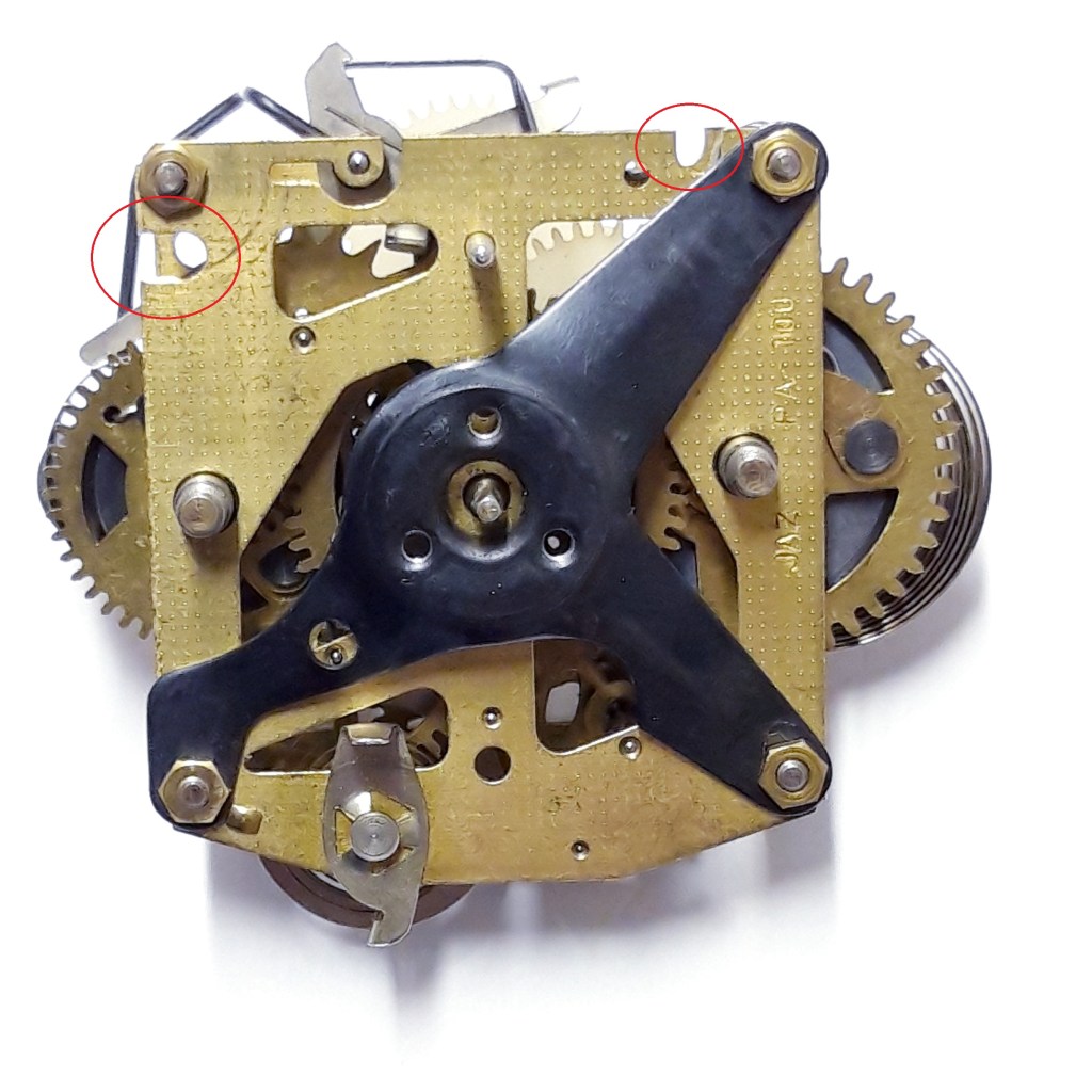 La platine arrière est percée de deux découpes pour le tournevis qui vissera la platine sur le porte cadran . Le support noir en métal se fixe sur trois boulons de la platine et trois pas de vis au centre pour la fixation du dos cloche