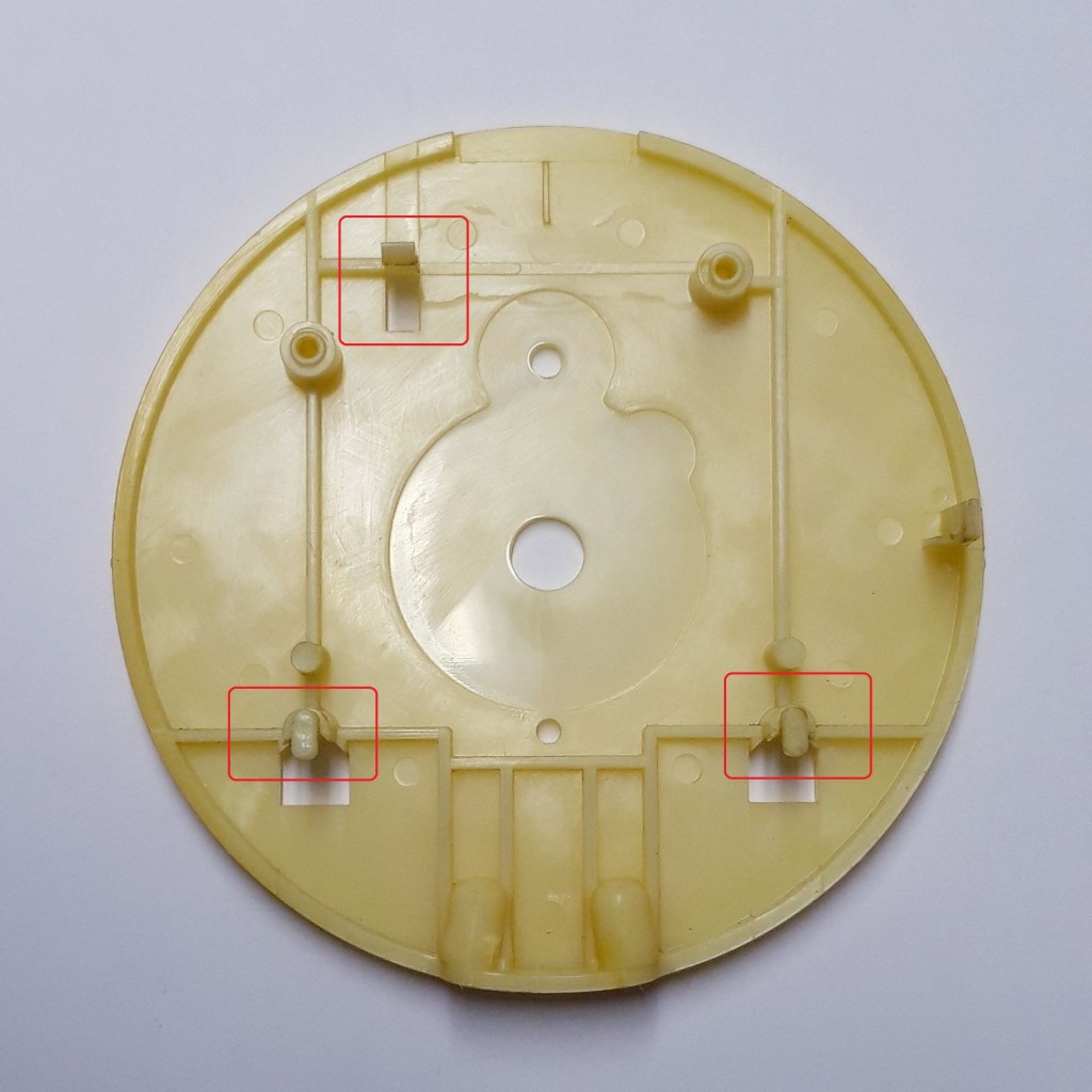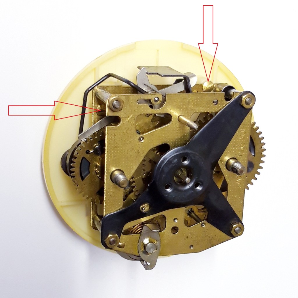 en plus des ergots le mouvement est fixé sur le porte cadran en plastique par deux vis