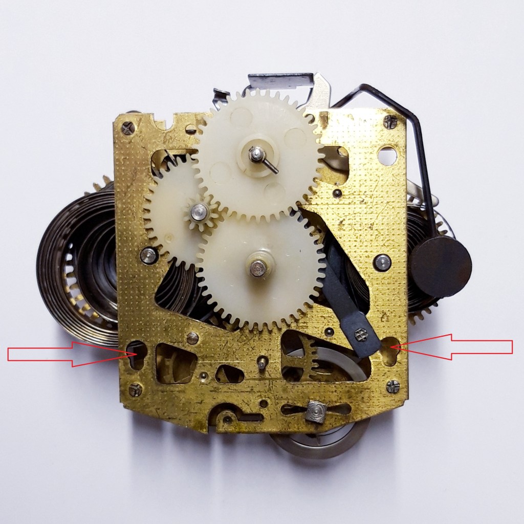 Le calibre présente sur la platine avant ( côté des aiguilles ) deux trous pour les vis de fixation sur le porte cadran .Les rouages ne sont plus en métal mais en DELRIN ( un plastique plus exactement un polyoxyméthylène )