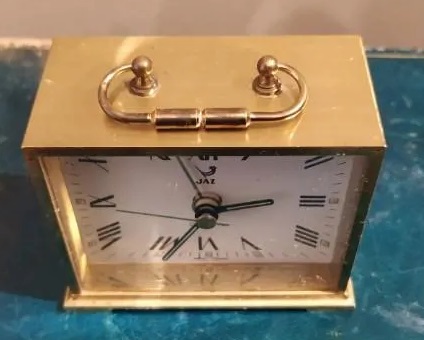 CASPIC , petit réveil à quartz , réveil moduleur à pile LR6 , calibre RK . Présenté dans le catalogue de 1980 à la page 2 , réf. 4532-71 . Boîtier en laiton doré , aiguilles et points lumineux , mention Jaz Paris en bas du cadran à gauche . Fonctionne avec une pile LR6. Format 7 x 6 cm.