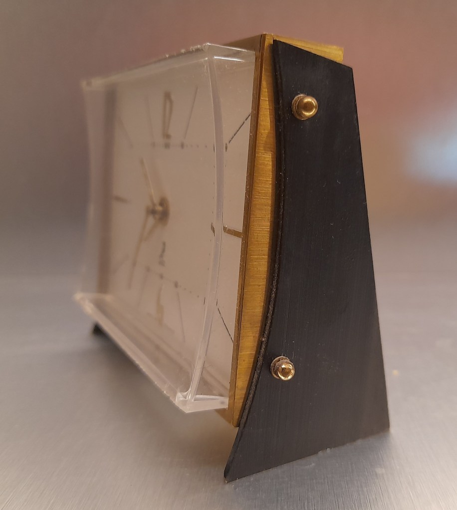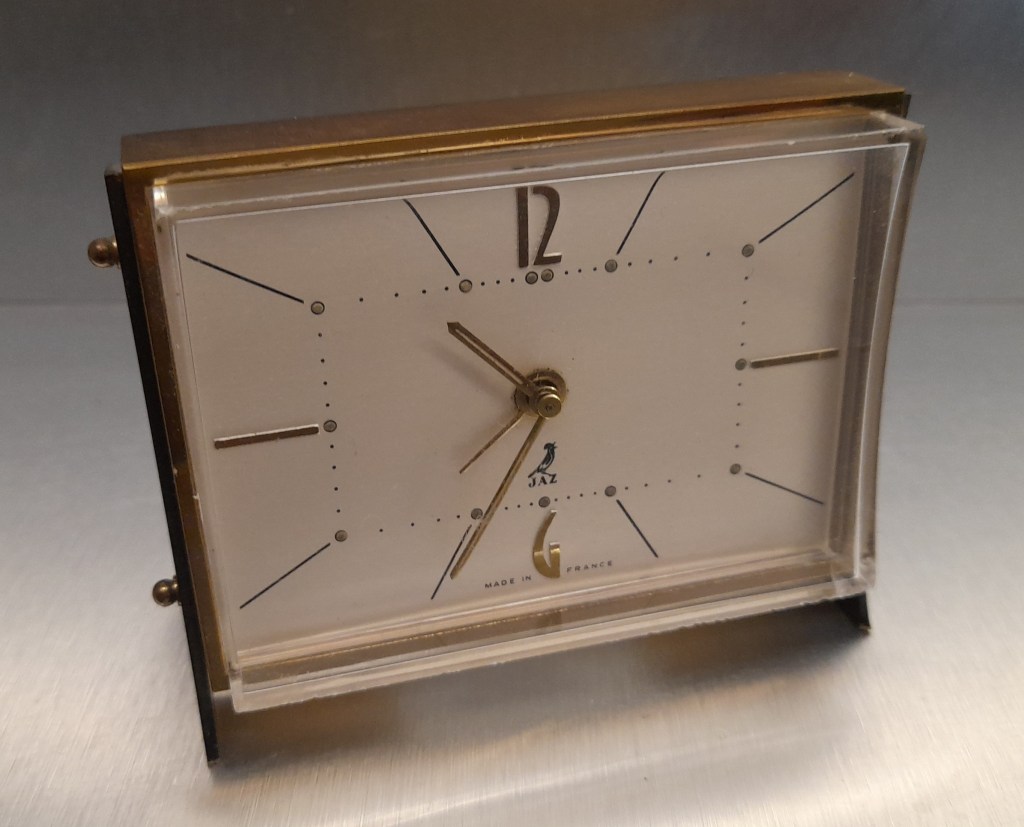 LETIC , réveil de la gamme des Stylites, mouvement mécanique , calibre J. Nouveauté du catalogue de 1965-1966 à la page 11 , référencée 525-11 . Boîtier métal façon or , joues plastique noir , cadran blanc avec deux chiffres et deux index relief façon or , quatre traits d’heures noirs , aiguilles métal façon or , aiguilles et points lumineux . Format 9 x 7,5 cm , poids 280 gr. Son cadran en plexiglas concave répond à la courbe des joues noires qui font office de côtés et de pieds . On retrouve le même style de joues noires sur son contemporain le PESIC , mais c’est un Jaz de Luxe de 1960/61et sur le CHEVRIC qui avait inauguré ce type de côtés noirs servant également de pieds . Dernière présence au catalogue 1966/67 .