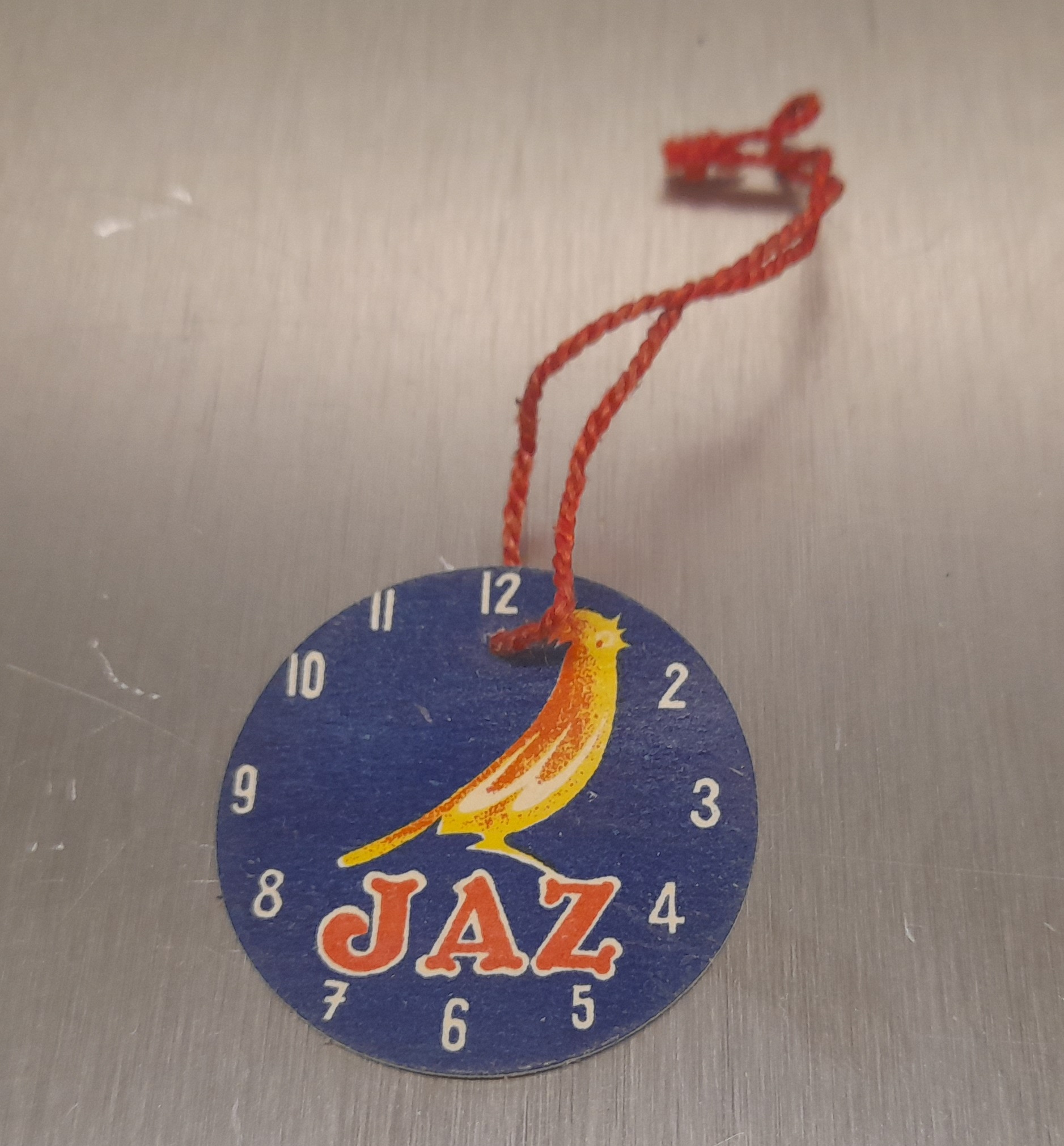 La C.I.M.H. , Compagnie Industrielle de Mécanique Horlogère première raison sociale de Jaz , proposait aux horlogers , dès les premières années de son existence , des étiquettes pour l’ensemble de sa collection , à accrocher sur les modèles de présentation. Les premières étaient propres à chaque article et payantes, disponibles dans les catalogues avec les réveils et pendules . La prospérité de la marque a entraîné une standardisation de cet article , dont le logo et la forme évolue avec les années, laissant un espace vierge pour y écrire le nom du modèle , sa référence ou son prix .