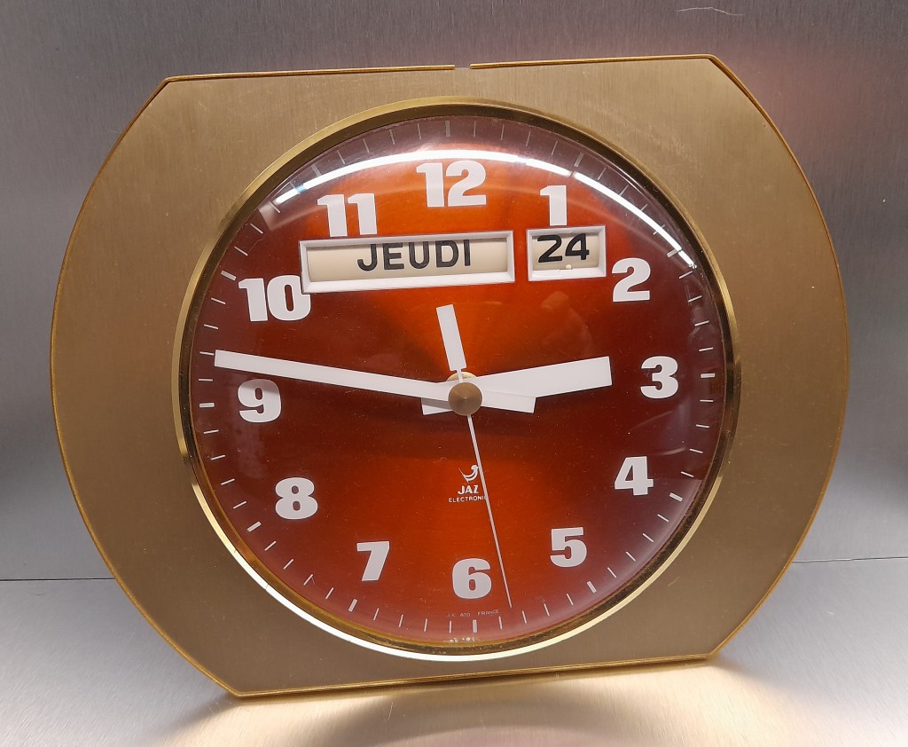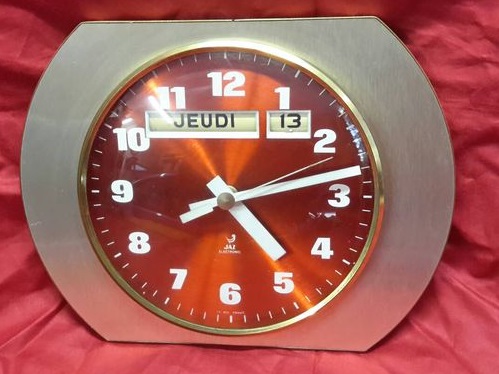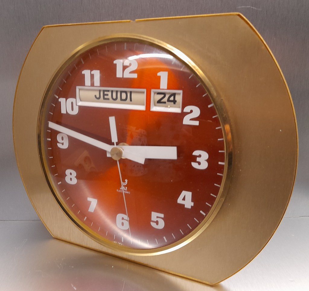 METIC , horloge murale , Jaz Electronic dateur , mouvement à pile LR14 , calibre TJ , licence ATO . Nouveauté du catalogue 1975 à la page 30 . Corps en Formica recouvert en façade d’une plaque de métal , trotteuse centrale , dateur : jour et date , vitre en verre bombé . Format 21 x 27 cm, poids 795 gr sans la pile . Cette nouvelle forme d’horloge ronde à pans coupés est attribuée la même année aux JOVIC qui sont en fait la version Formica faux bois des METIC . Présente aux catalogues de 1975 à 1977 . Cette plaque de métal est à l’origine de sa dénomination METIC . Références 4712-30 pour le métal argenté / cadran bleu 4712-30 et 4712-70 pour le métal doré et cadran rouge.