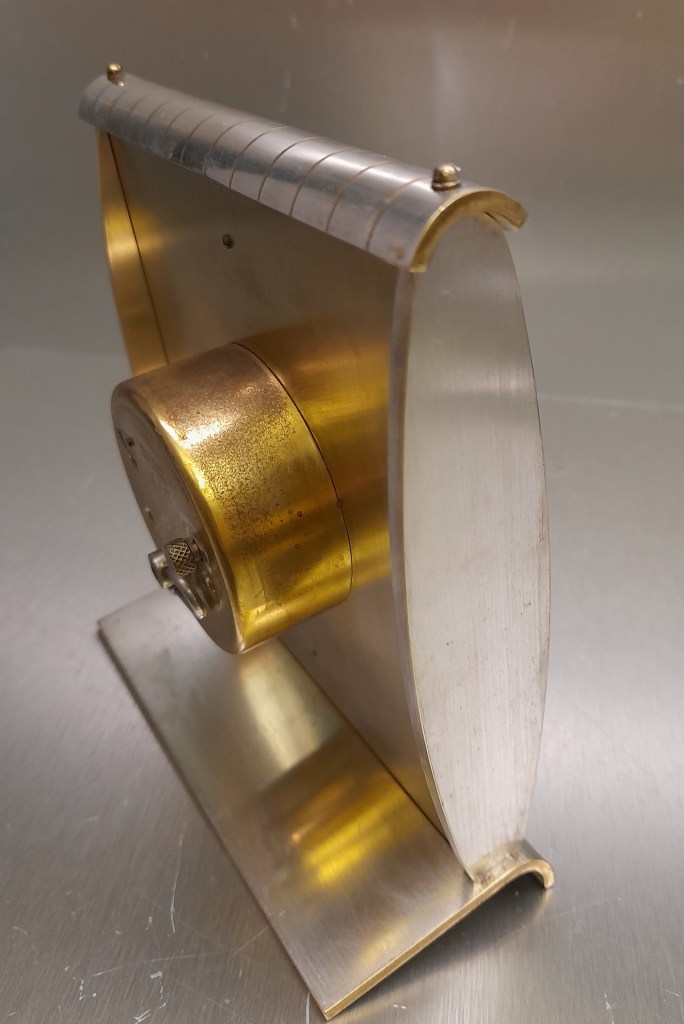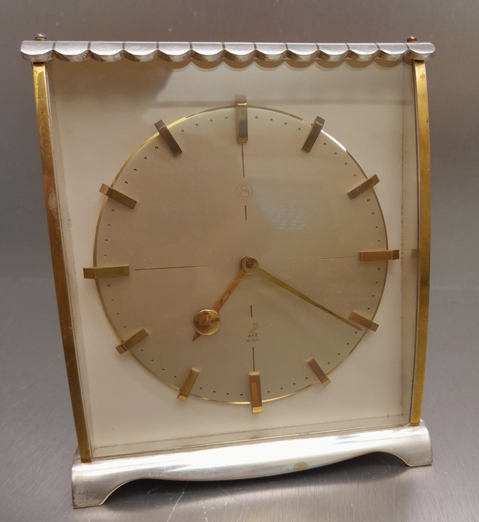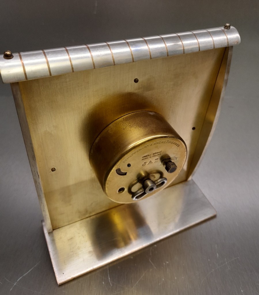 TUILIC , grand réveil , gamme Jaz de Luxe , mouvement mécanique , calibre K , autonomie 8 jours . Nouveauté du catalogue 1959/60 à la page 3 , référencée 864-10 . Socle et joues métal façon or et argent ; chapiteau argenté ; cadran argenté cerclé façon or sur fond champagne ; pas de chiffres mais des index en haut relief , verre cintrée en plexiglas , non-lumineux . Format 15,5 x 13,5 cm, poids 835 gr . Brève existence pour le TUILIC qui n’est proposé que dans les catalogues 1959/60 et 1960/61 . Son nom lui vient évidemment des petites tuiles de son chapiteau .