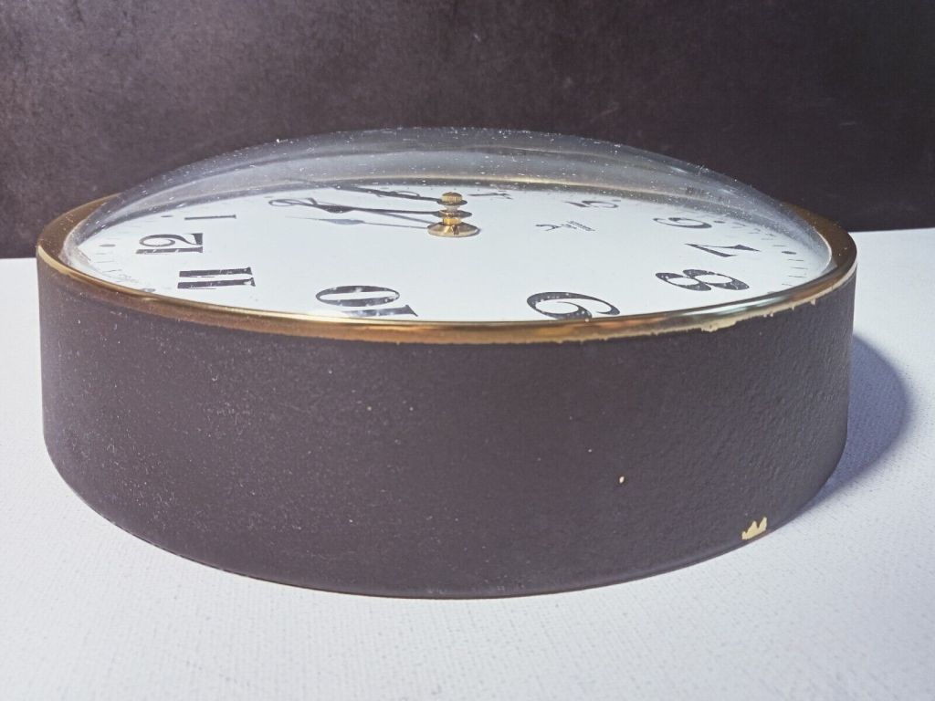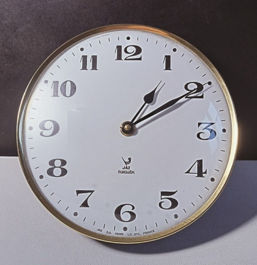 NORMIC , pendule murale , gamme Jaz Transistor , mouvement électrique à pile LR14 , licence ATO , calibre AN . Nouveauté du catalogue 1969/70 à la page 28 , référencée 2251-40 . Boîtier noir , cadran blanc , chiffres Breguet , garnitures façon or , aiguilles poire et feuille . Diamètre 21 cm.