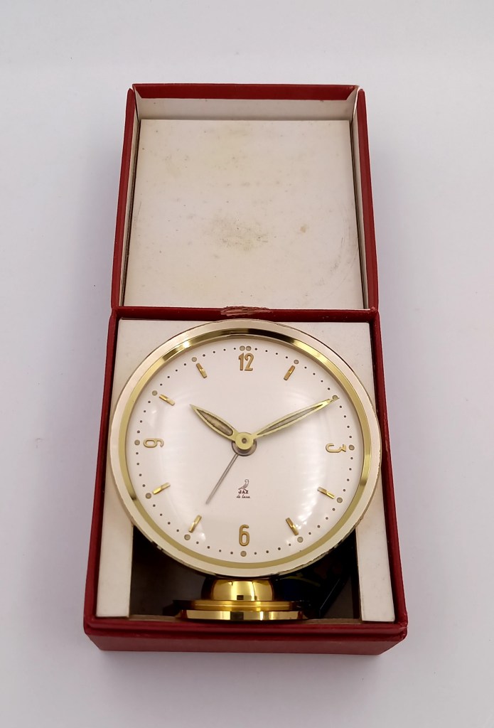 Boîtier et socle en métal façon or , filet argent , cadran argent mat , chiffres en relief , lumineux . Présent uniquement aux catalogues 1959/60 et 1960/61 .