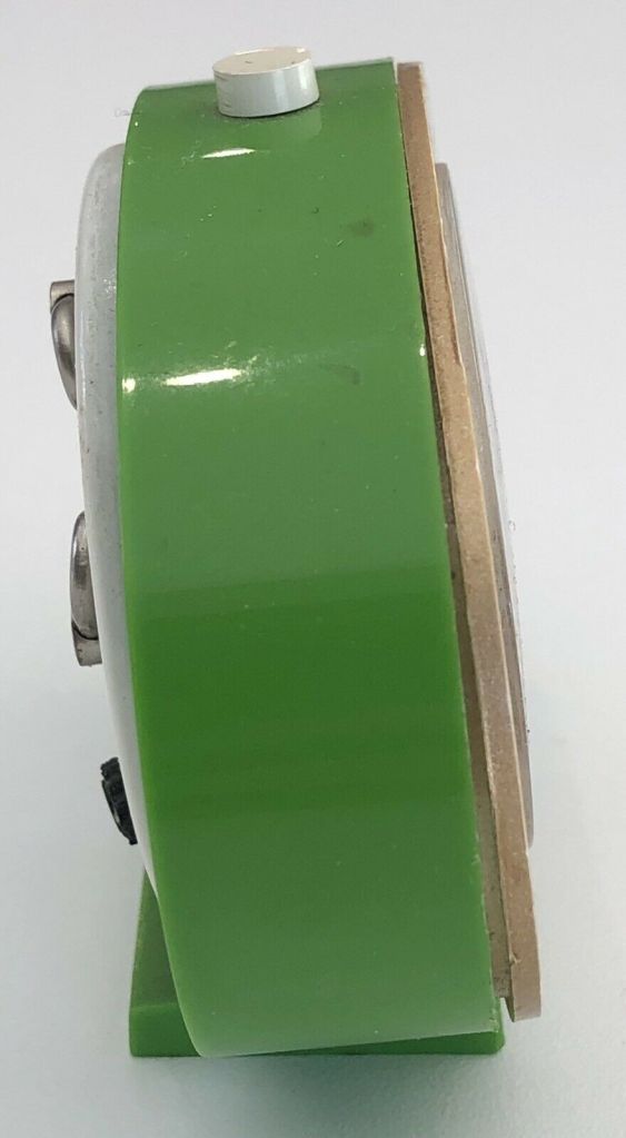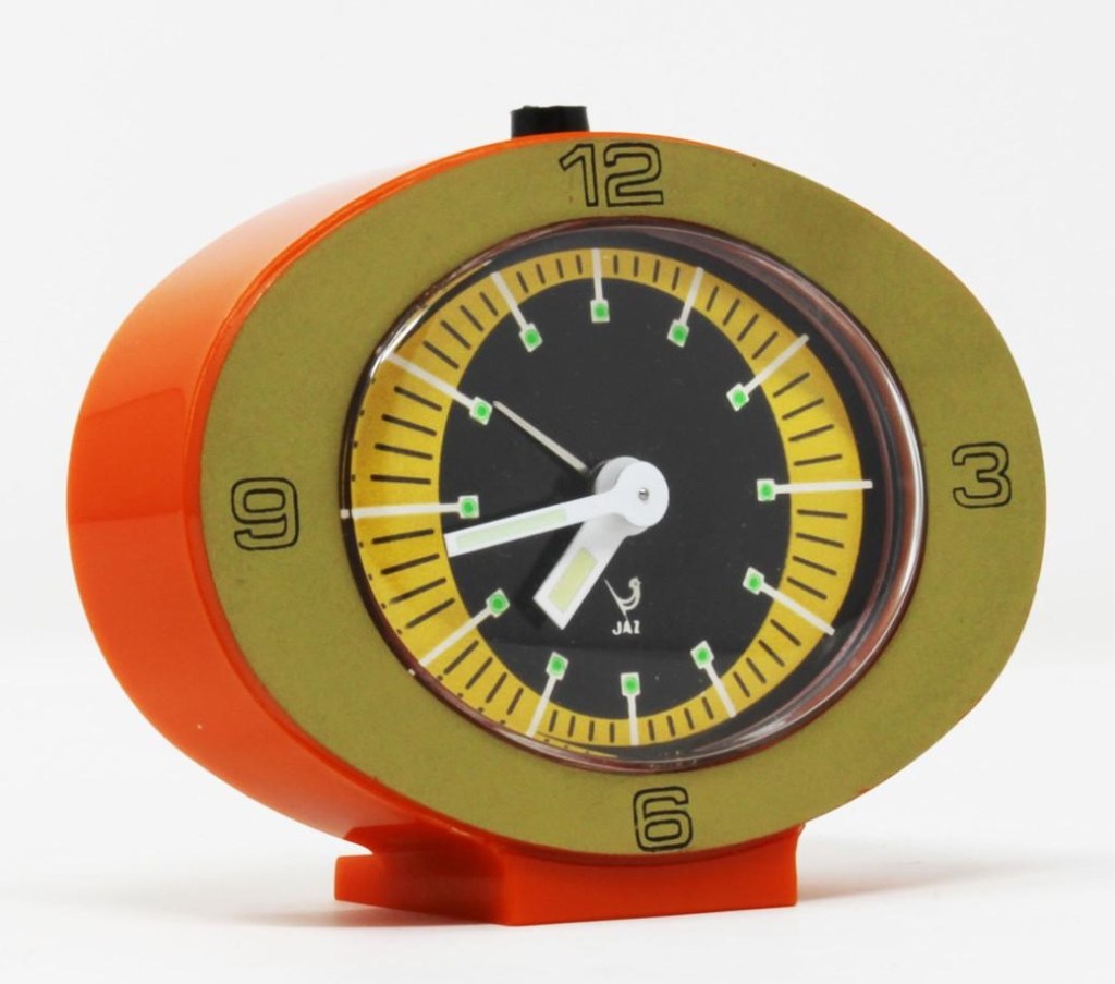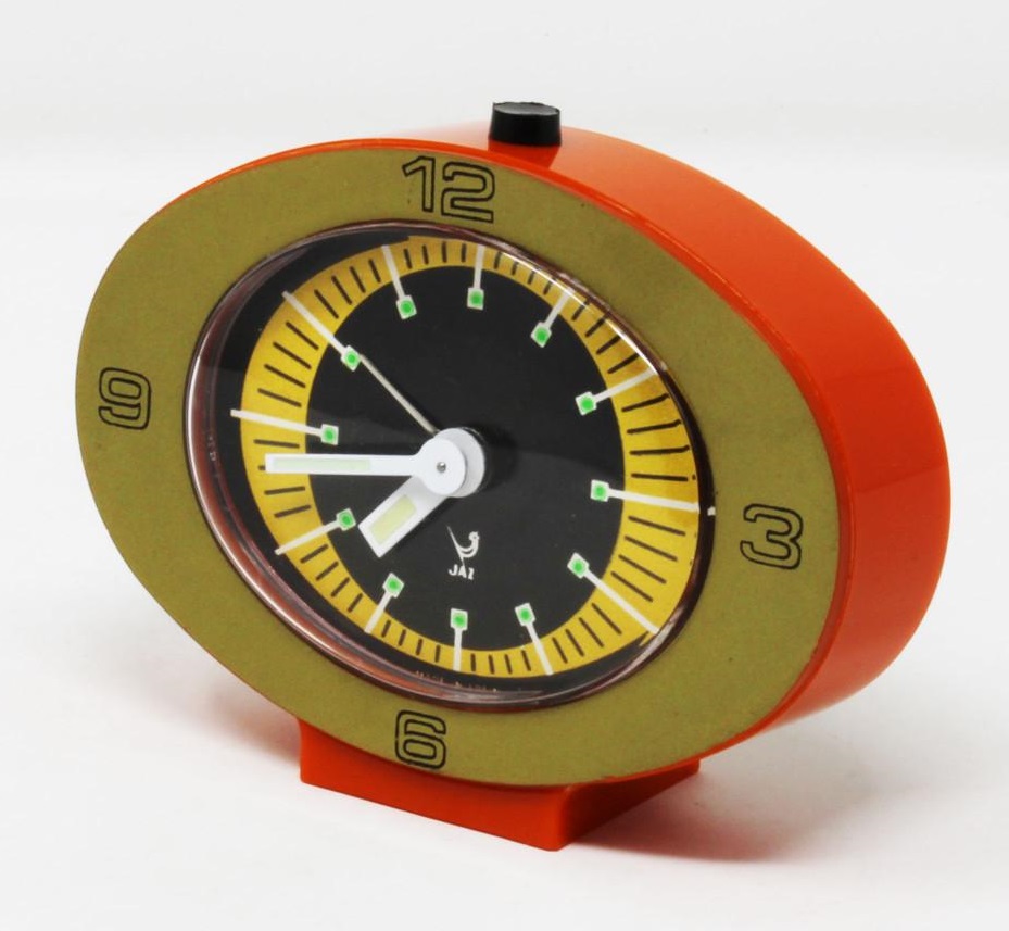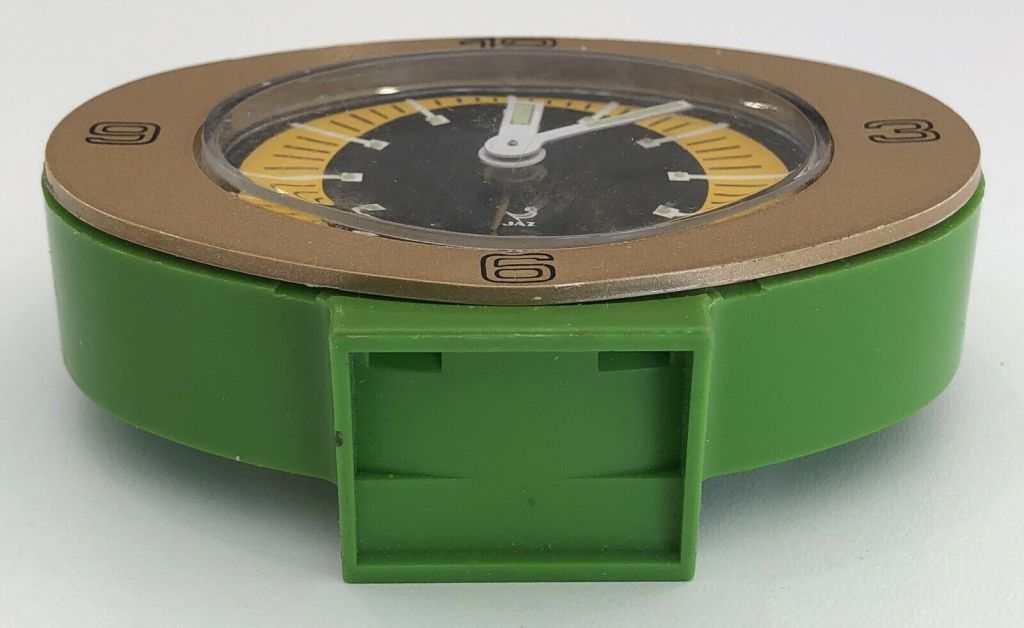 LIPSIC 1339-71 façade grise /zone des heures et corps jaune . LIPSIC , petit réveil , mouvement mécanique , calibre DK . Nouveauté du catalogue 1974 à la page 10 . Boîtier et socle en plastique d’une seule pièce , vitre ovale en plexiglas , aiguilles et points lumineux , mention Made in France en bas de cadran et mention France au dos . Format 9,5 x 7 cm, poids 125 gr.