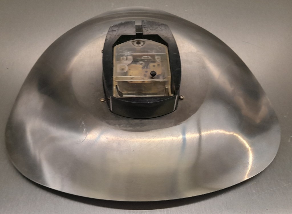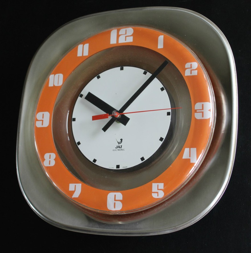 NOXIC , pendule murale de la gamme Jaz Transistor , mouvement électrique à pile LR14 , calibre AX , licence ATO . Nouveauté du catalogue 1972-1973 à la page 18 , référencée 2255-10 . Corps triangulaire incurvé en acier inoxydable , cadran en plastique de couleur corail , vitre en plexiglas clipsée , trotteuse centrale blanche . Format 30 x 30 cm, poids 840 gr .