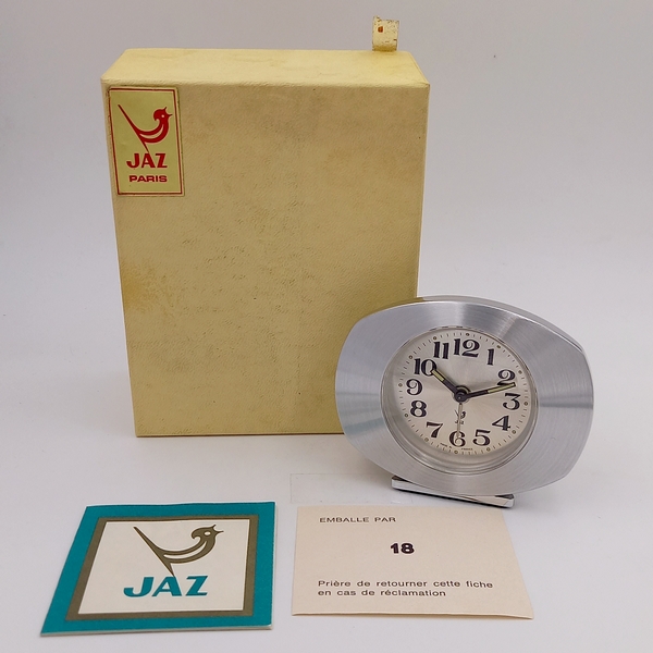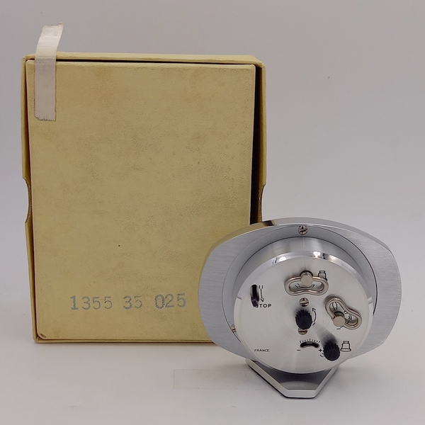 CURVIC , petit réveil , mouvement mécanique , calibre DK . Nouveauté du catalogue 1974 à la page 11 , référencée 1355-31 . Boîtier et socle en aluminium poli , cadran bleu profond irisé , aiguilles et points lumineux . Format 9 x 7,5 cm.