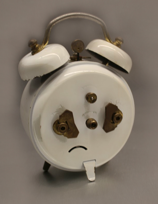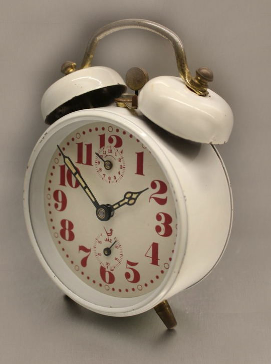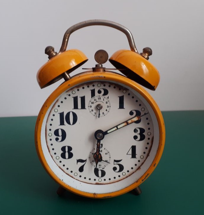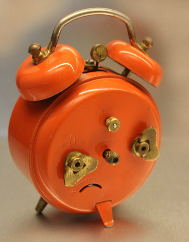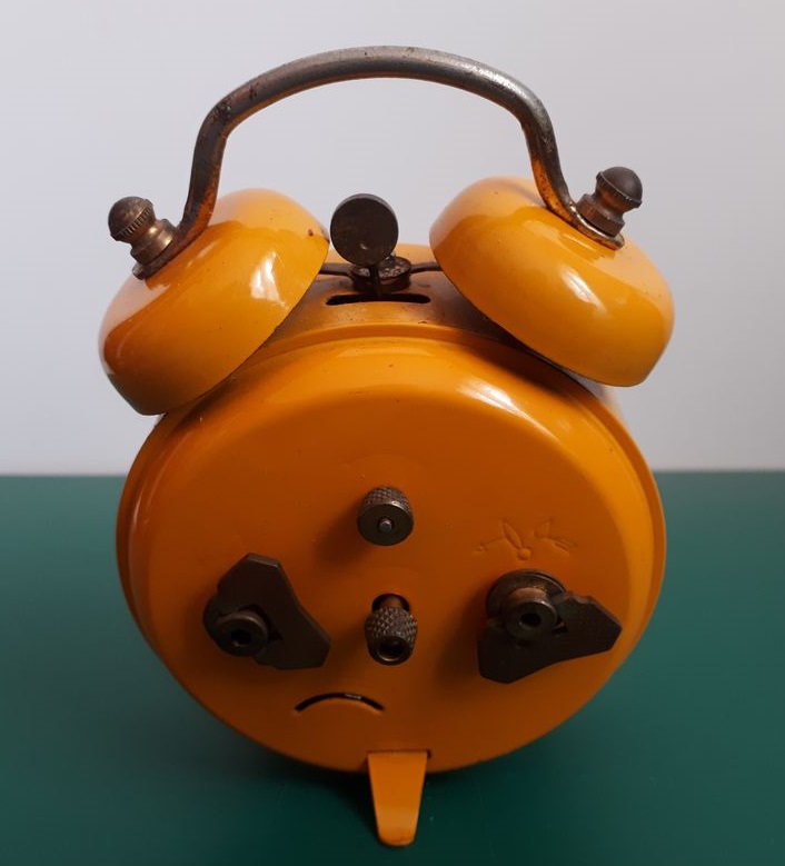CLIBIC , réveil de la gamme des Gros Jaz , mouvement mécanique , calibre PA . Nouveauté du catalogue 1974 à la page 28 . Boîtier métal peint , sonnerie sur deux clochettes peintes et reliées par une bélière , aiguilles cathédrales , aiguilles et points lumineux . Diamètre 8,7 cm, poids 315 gr .