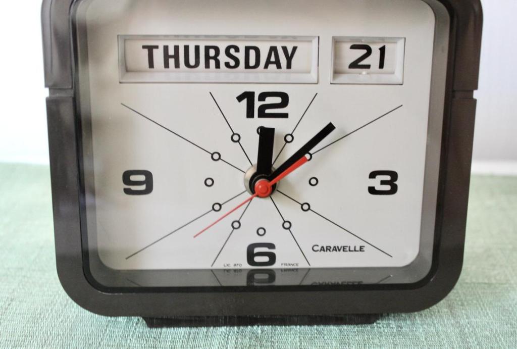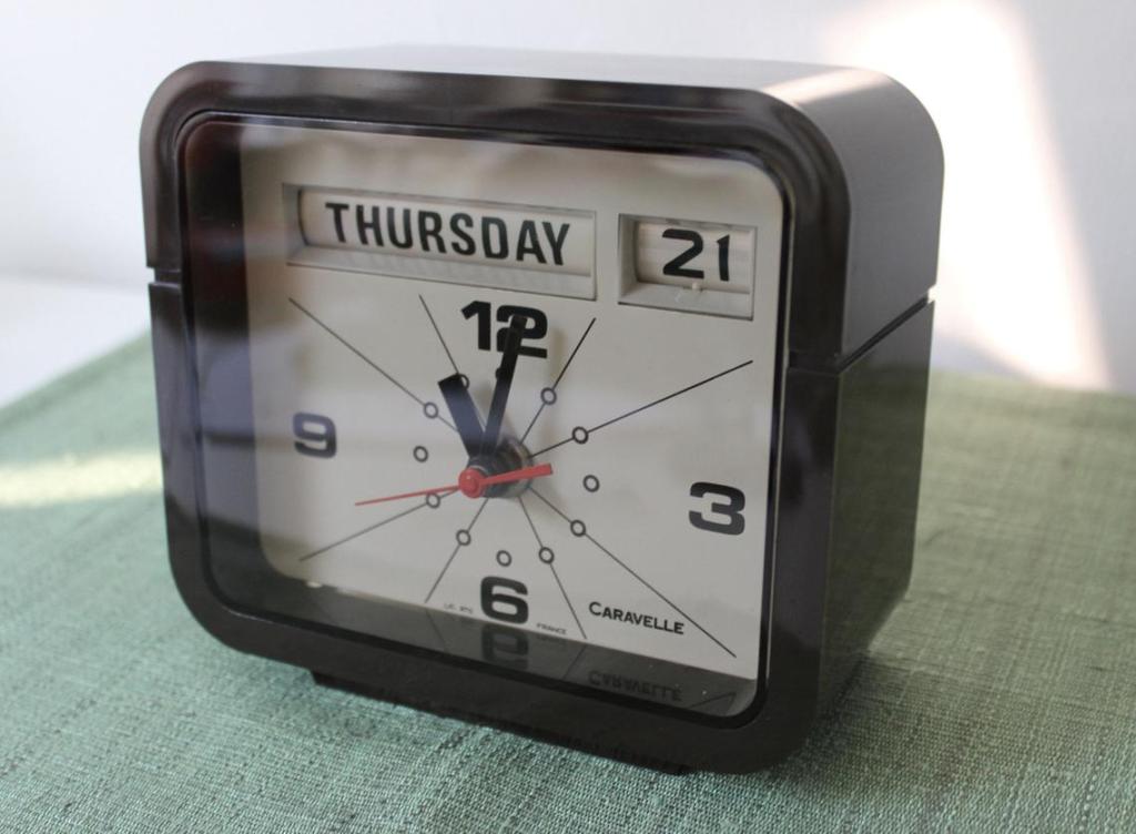 BAMIC , grand réveil à dateur , gamme des Jaz Electronic , mouvement à pile , calibre TC , licence ATO . Nouveauté du catalogue 1975 à la page 10 . Boîtier en plastique , trotteuse centrale , arrêt de sonnerie au dos , dateur jour et date , aiguilles et points lumineux .