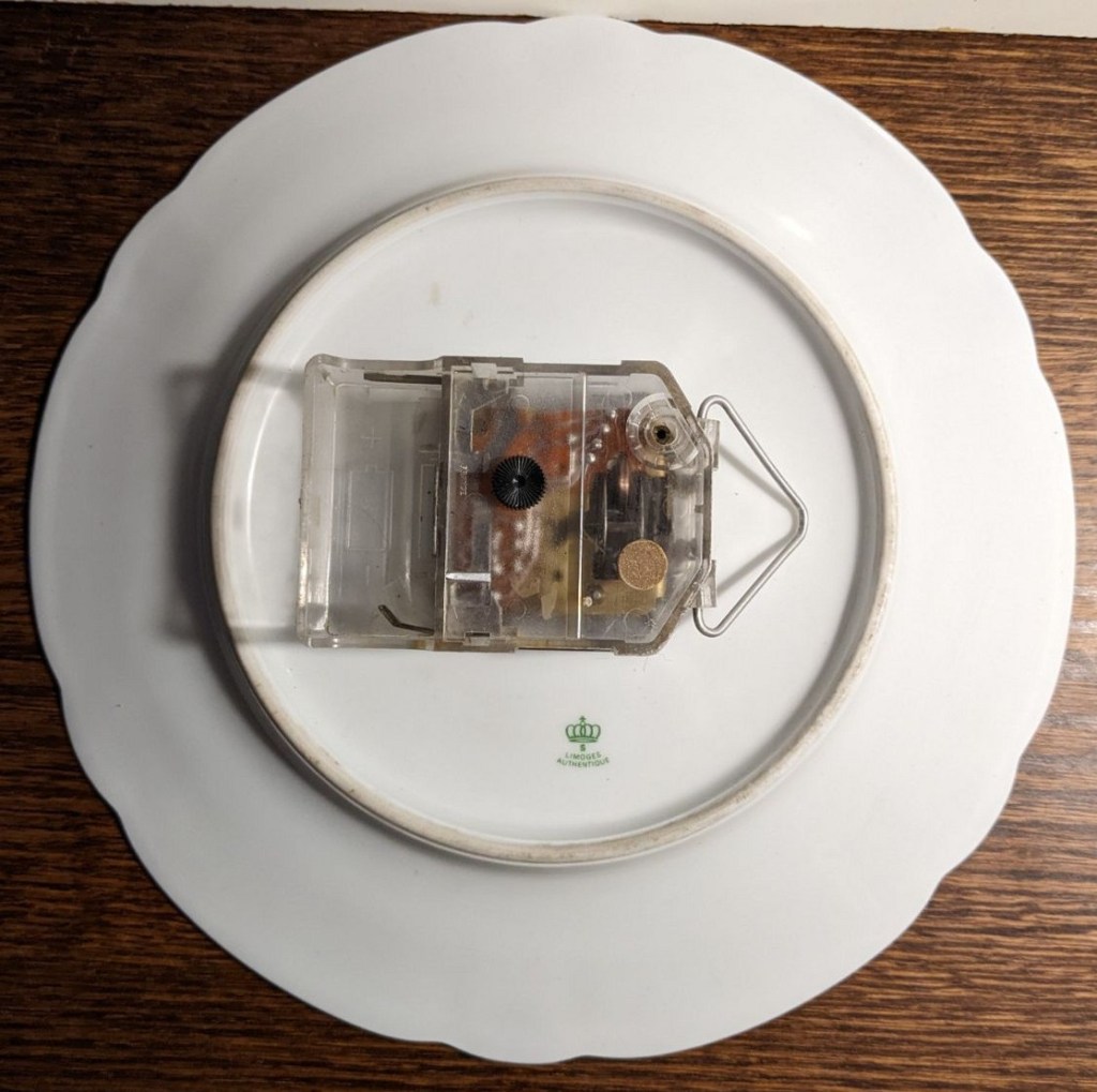 FIORIC , horloge murale , Jaz Electronic , mouvement à pile LR14 , calibre TM , licence ATO . Nouveauté du catalogue 1976 à la page 24 , référencée 4224-10 . Diamètre 26 cm . Assiette en porcelaine de Limoges , motifs floraux , aiguilles style Louis XV , sans trotteuse . Dernière apparition au catalogue de 1977.