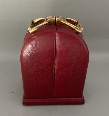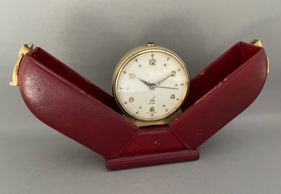 GAPIC , réveil de voyage , gamme Jaz de Luxe , mouvement mécanique , calibre AB , 7 pierres , échappement à ancre , à sonnerie limitable . Boîtier en métal doré , gainerie en cuir , fermée par deux étriers en métal doré , cadran argenté , chiffres en relief , aiguilles et points lumineux . Nouveauté du catalogue 1953 . Format 8 x 11 cm, poids 442 gr .