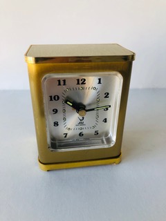 DULIC , petit réveil , Jaz Electronic , sonnerie par moduleur buzzer , mouvement électronique à pile , à tic-tac discret , calibre TR , licence ATO . Nouveauté du catalogue 1977 à la page 4 référencée 4461-75 . Boîtier en métal façon or, aiguilles et points lumineux . Format 7 x 9 cm. Il n’est déjà plus disponible en 1978.