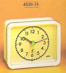 Sur cet exemplaire du collectionneur Marc Barat on a la confirmation d’une trotteuse verte pour 4539-15 et surtout des chiffres à l’intérieur du chemin de fer , alors que pour le noir 4539-45 la trotteuse est jaune et ses gros chiffres sont à l’extérieur du chemin de fer Quatre modèles disponibles: Boîtier blanc et cadran blanc réf. 4539-11 ; Boîtier blanc et cadran jaune réf. 4539-15 ; Boîtier noir et cadran métal argent réf. 4539-41 ; Boîtier noir et cadran façon or réf. 4539-45 .