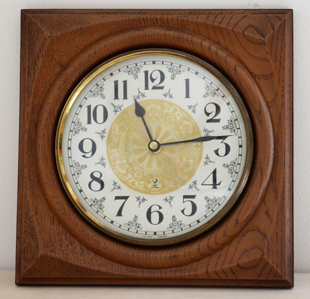 BOISIC , horloge murale , Jaz Electronic , mouvement à pile LR14 , calibre TM , licence ATO . Disponible uniquement dans le catalogue 1978 à la page 25 , référencée 4228-10 . Forme de carré résine façon bois sculpté et veiné , pas de trotteuse, vitre en verre bombé, aiguilles poire et feuille , chemin de fer rond au pourtour du cadran, mention France . Format 26 x 26 cm, poids sans pile 1,235 gr.