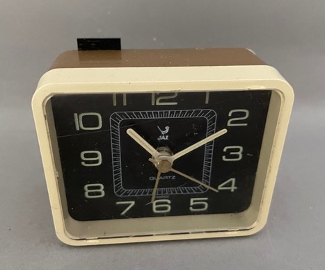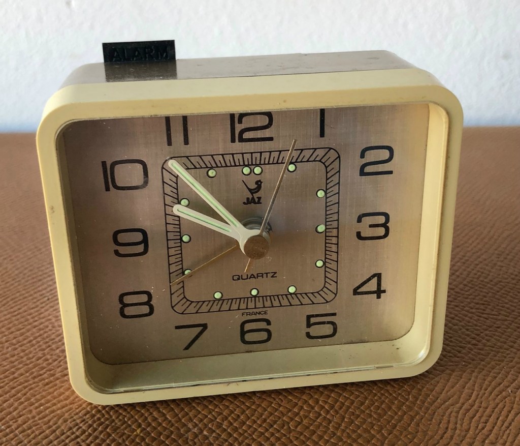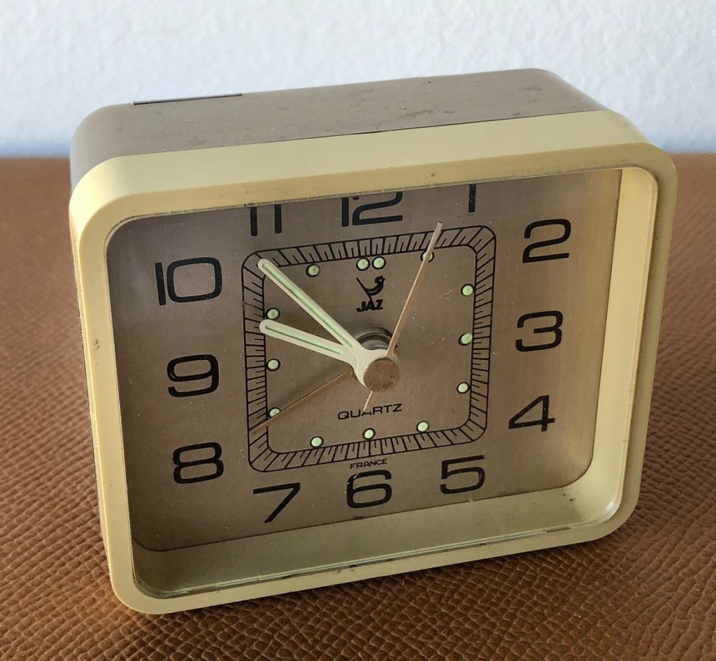 HOUSSIC , réveil de la gamme Jaz Quartz , à sonnerie par moduleur buzzer , silencieux , mouvement électrique à pile LR6 , calibre RK . Nouveauté du catalogue 1979 à la page 4 . Boîtier en plastique , aiguilles et points lumineux , trotteuse centrale , chemin de fer carré à l’intérieur de la zone des heures , mention France au cadran et au dos . Deux versions disponibles : cadran noir réf. 8027-31 ou cadran doré réf. 8027-81 . Format 7,5 x 6,5 cm .