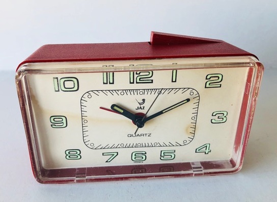 CARMIC 8026-51 CARMIC , petit réveil de la gamme Jaz Quartz , à sonnerie par moduleur buzzer , silencieux , mouvement électrique à pile LR6 , calibre RK . Nouveauté du catalogue 1979 à la page 7. Boîtier en plastique , vitre en plexiglas , arrêt de sonnerie au sommet , chemin de fer allégé à l’intérieur de la zone des heures , aiguilles et points lumineux , trotteuse centrale rouge . Trois versions disponibles : noir à cadran doré réf. 8026-41 , blanc à cadran doré réf. 8026-51 ou blanc à cadran noir 8026-61 . Format 10,5 x 6,7 cm . Le CARMIC est une variante – et l’anagramme- du CRAMIC .