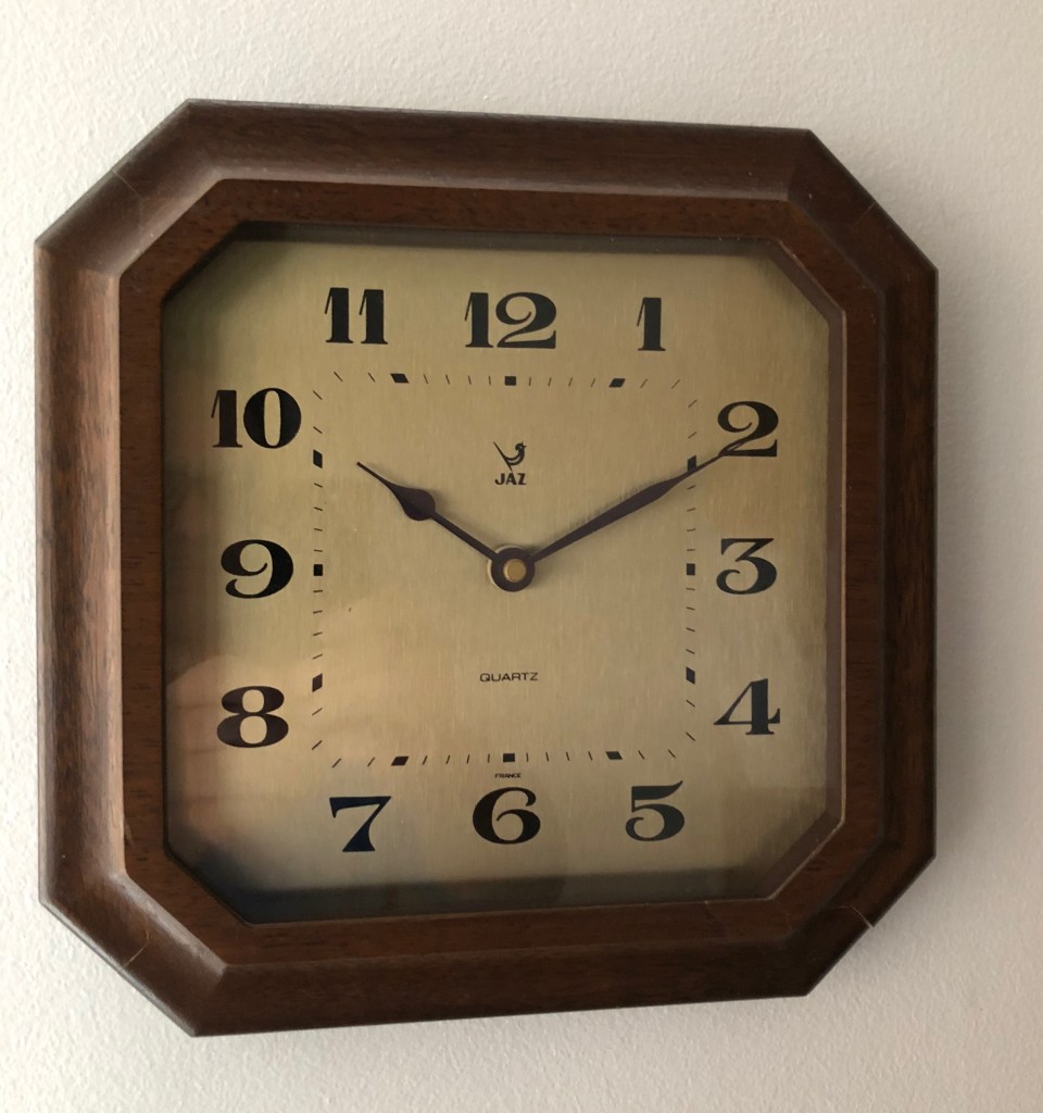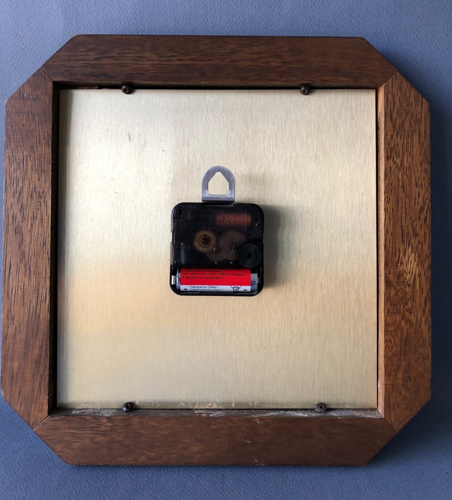 GANSIC , horloge murale de la gamme Jaz Quartz , mouvement à pile LR6 , calibre MAK . Nouveauté du catalogue 1982 à la page 20 , référencée 7162-10 . Boîtier octogonal en bois teinté noyer, cadran doré , aiguilles noires poire et feuille mention France en bas de cadran . Format 26 x 26 cm .