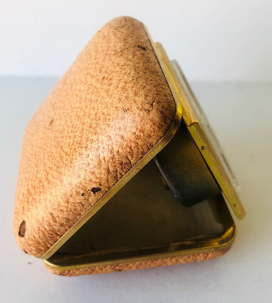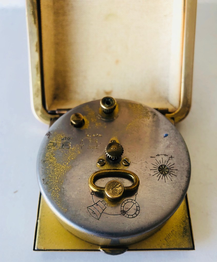GAPIC , réveil de voyage , mouvement mécanique , calibre CS , 7 jewels . Nouveauté du catalogue 1982 à la page 37 . Coque plastique gainée cuir , cadran doré, chiffres romains , aiguilles scoties , aiguilles scoties , aiguilles et points lumineux. Disponible en deux coloris : naturel réf. 1463-71 ou noir réf. 1463-41 . Format 7,3 x 7,7 x 3 cm .