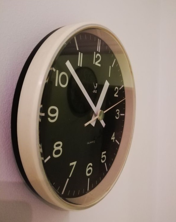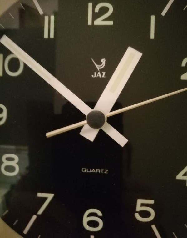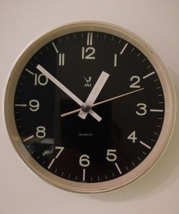 MULIC , petite horloge murale de la gamme Jaz Quartz , mouvement à pile LR6 , calibre MAK . Nouveauté du catalogue de 1982 à la page 30 . Boîtier en matière plastique moulée vitre en plexiglas plat , aiguilles et chiffres lumineux , trotteuse centrale . Diamètre 21,5 cm , poids 400 gr sans la pile . Cette horloge murale est une exception dans la gamme Jaz en raison de ces aiguilles et chiffres lumineux ce qui n’avait jamais été le cas depuis les origines de la marque .